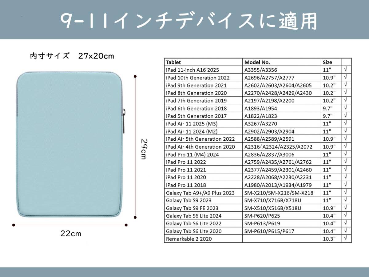 「対応機種」 外部寸法:29 x 22 x 2 cm。9~11インチまでのノート・タブレットPCに適用します。iPad 第11世代 2025、iPad Air/Pro 11インチ(M3/M2)、iPad 第10世代 2022、iPad mini 第7/6世代、iPad Air 10.9インチ 第5/4世代、iPad 第9世代 10.2 2021、iPad 第8世代 10.2 2020、iPad 第7世代 10.2インチ 2019、iPad Air(第3世代) 10.5インチ2019、iPad Pro 11インチ(2018/2020/2021)、iPad Pro 10.5インチ 2017、iPad 9.7 第6/第5世代(2018 / 2017)、iPad 1/2/3/4、iPad Air / Air 2、fire HD 10 / 10 Plus、Surface Go 等に適用します。ご購入の際に、機種とサイズを予めご確認ください。