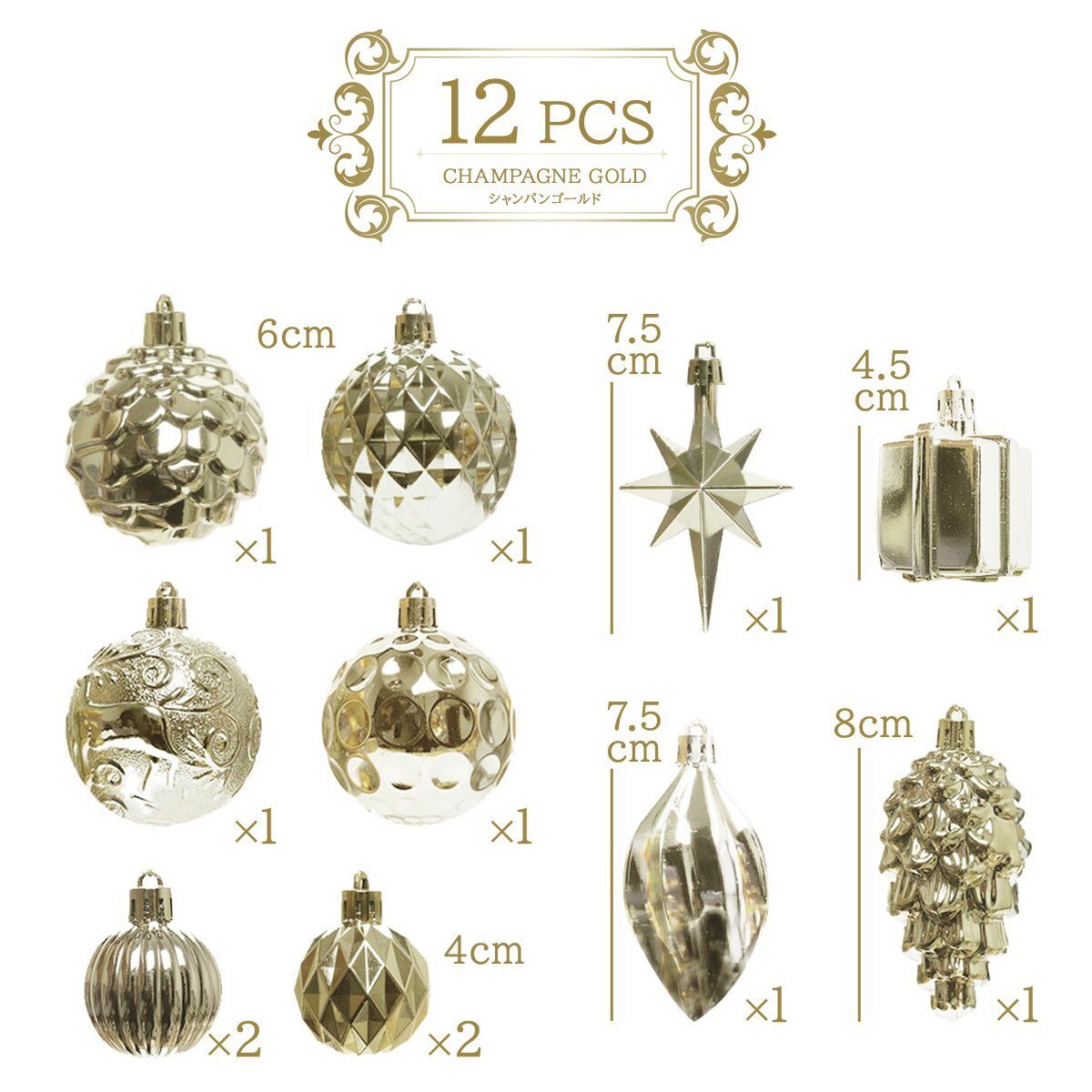 クリスマスツリーオーナメント アソート 12個セット シャンパンゴールド ラメ無し ボール 装飾 Xmas Christmas デコレーション インテリア