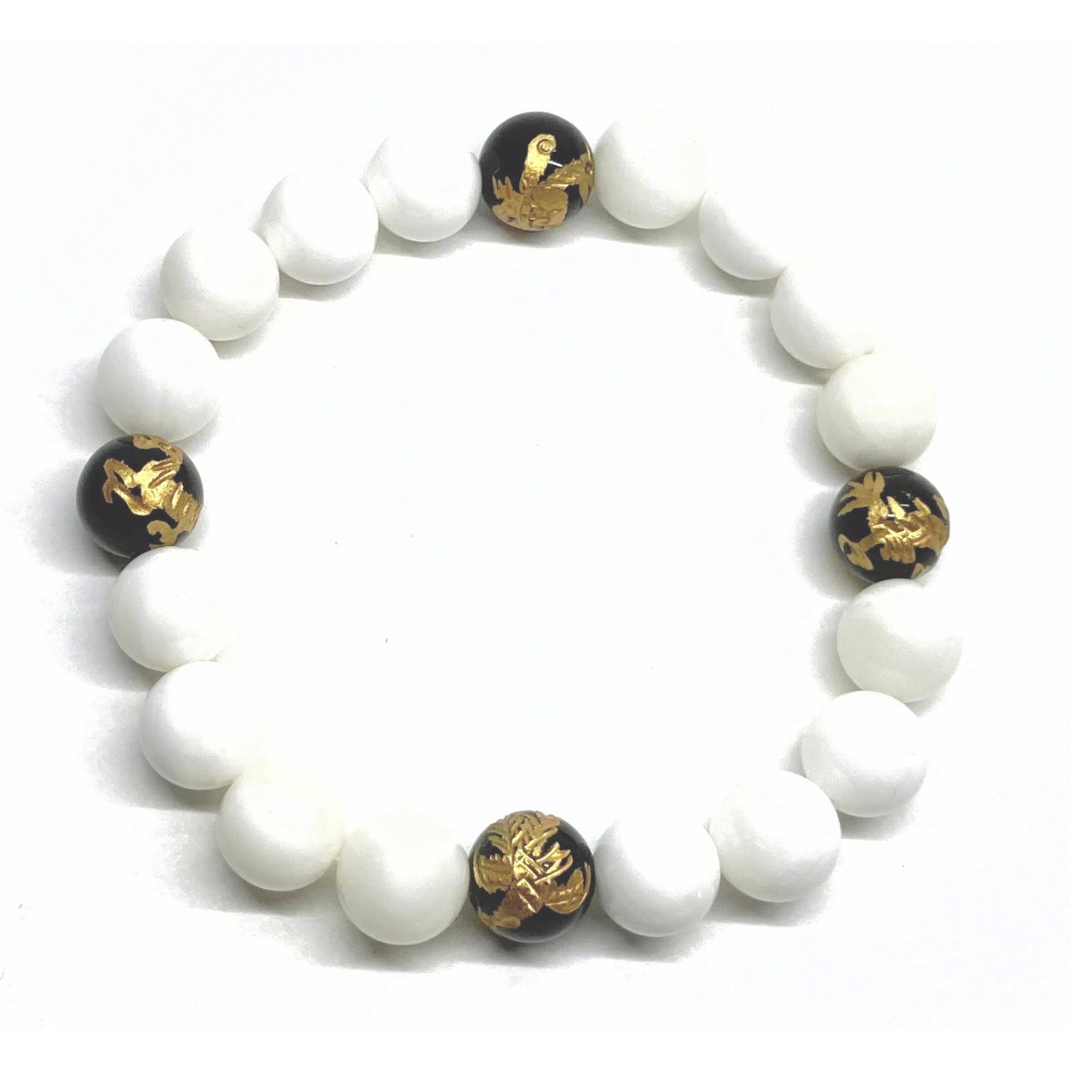 こちらは、四神獣金彫オニキスとホワイトオニキスを組み合わせたパワーストーンブレスレットです。四神獣は、中国の伝説で4つの方向(東西南北)を守護する神聖な神。四神獣、厄災から身を守り、多くの運気を呼び込むと言われております。石大きさは程よくインパクトのある10mm玉で内周 約17cmです。 数に限りがございますので気になる方はお早めにどうぞ。
