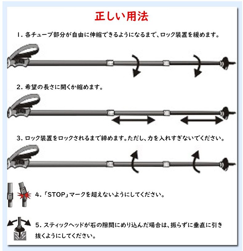 【材質】:(アルペンストック)7075アルミニウム合金、(先端)スチール、(ハンドル)ゴム、(バネ)ステンレススチール