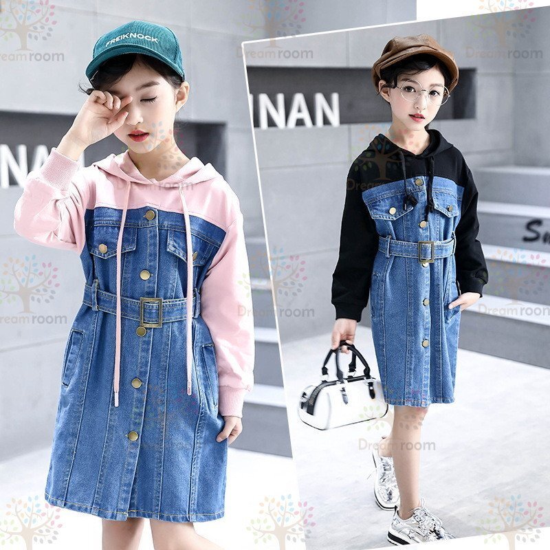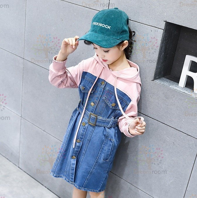 kids デニム切り替え ハイウエスト ワンピース 【120cm】ピンク 女の子 パーカー 学生 秋服 長袖 K-419pk