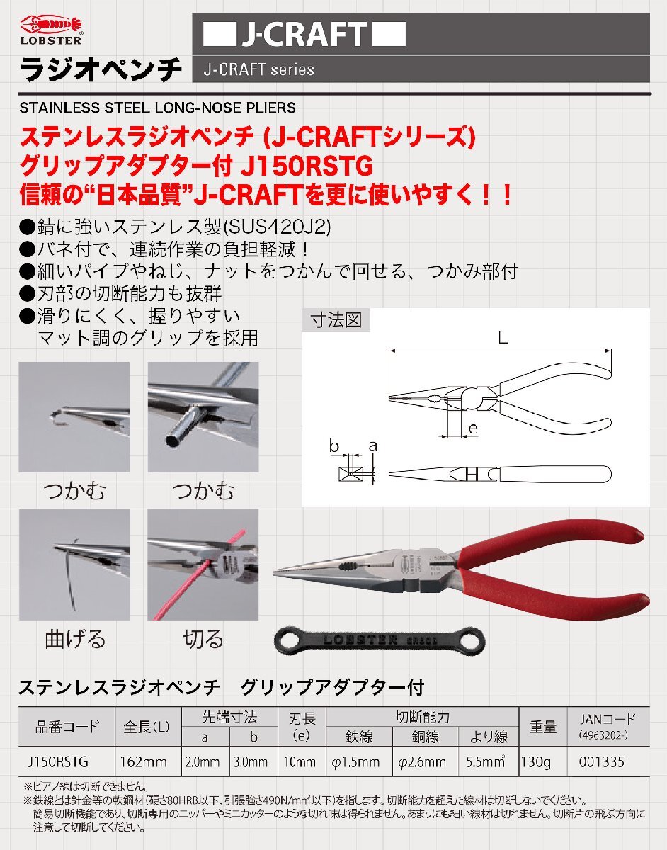LOBSTER(エビ印)ステンレスラジオペンチ J150RSTG 〔ステンレスラジオペンチ (J-CRAFTシリーズ) グリップアダプター付 J150RSTG〕