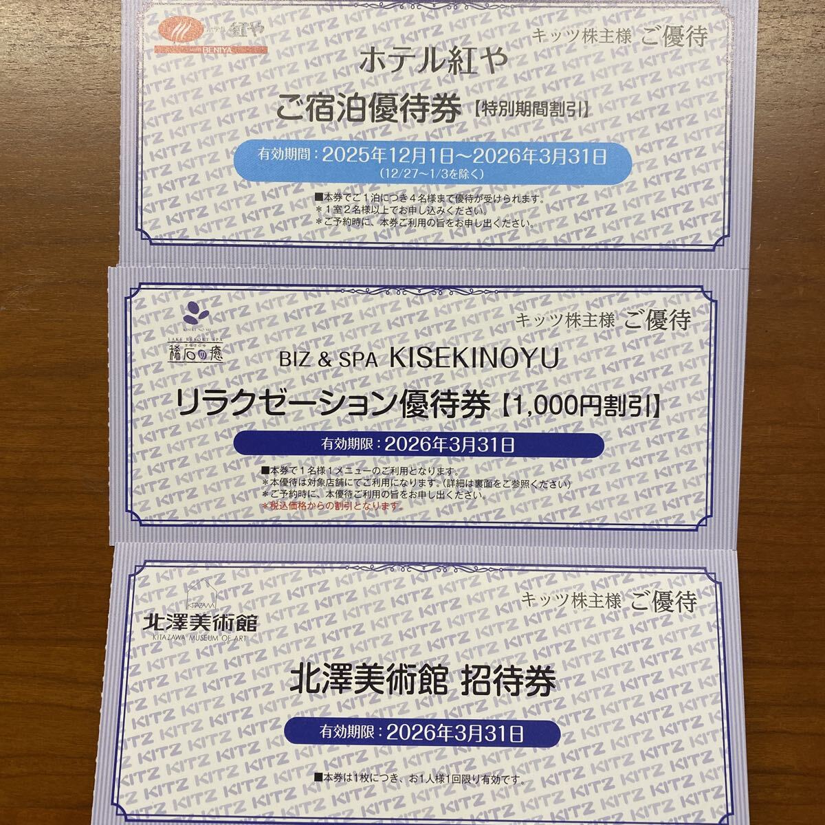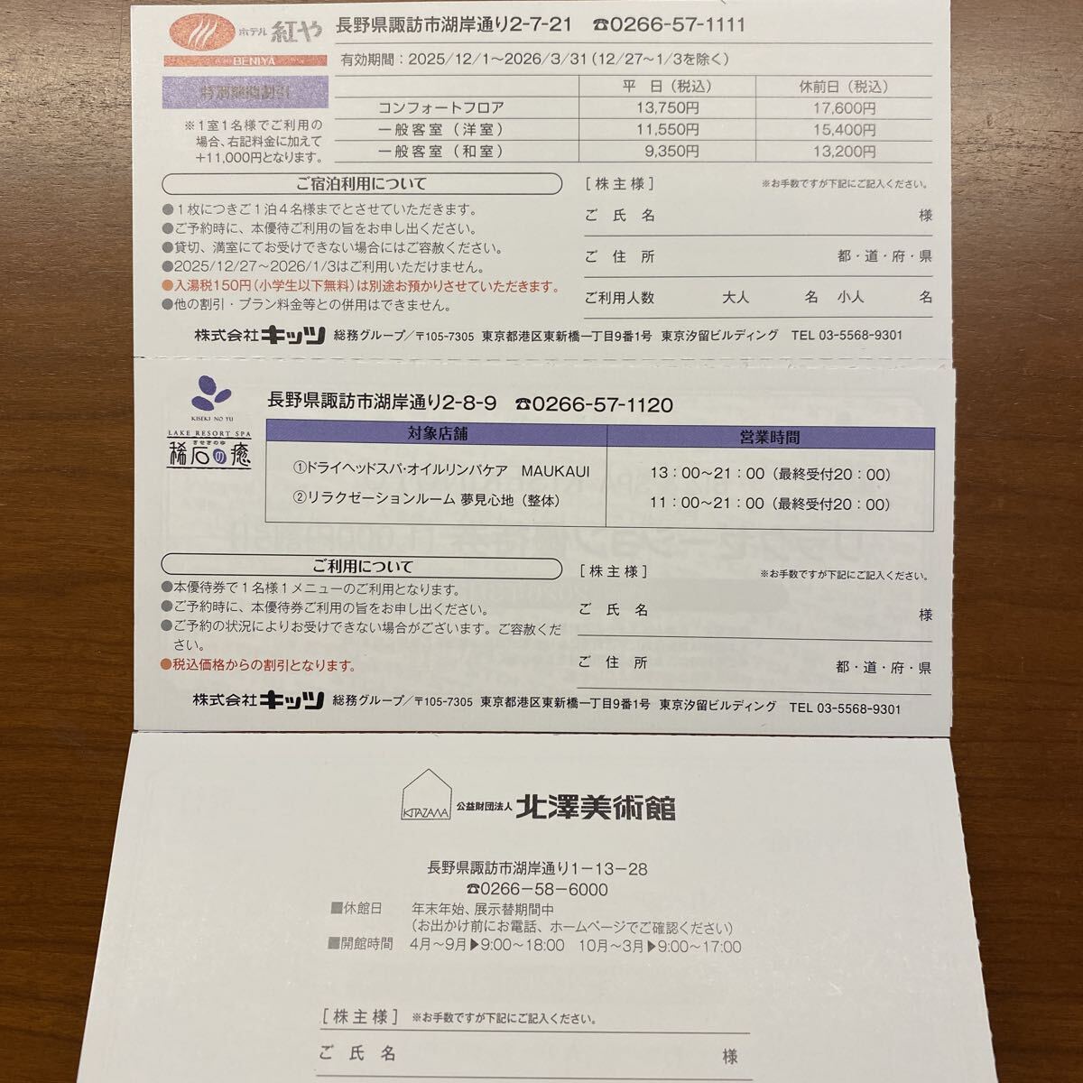 キッツの株主優待で、長野県の諏訪湖湖畔にあるホテル紅やご宿泊優待券(特別期間割引)&リラクゼーション優待券&北澤美術館招待券のセットです。