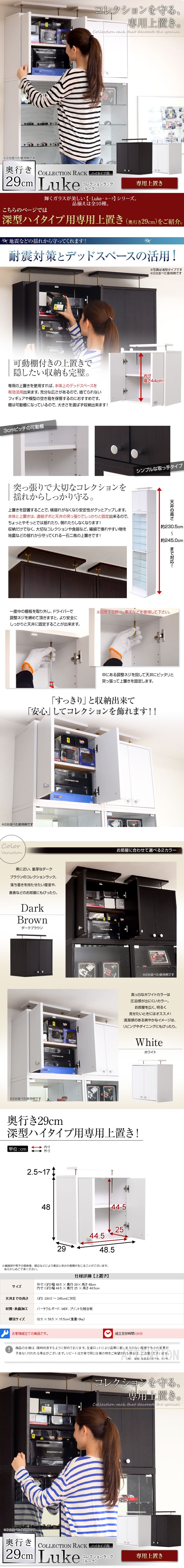 【カラー】 ホワイト、ダークブラウン 【サイズ】 外寸:(約)幅48.5cm×奥行29cm×高さ48cm 内寸:(約)幅44.5cm×奥行25cm×高さ44.5cm ※天井までの高さ:(約)230.5?245cmに対応 【重量】 (約)7kg 【材質】 パーチクルボード、MDF、プリント化粧合板 【梱包】 (約)32.5×58.5×15.5cm(1.0才) (約)8.9kg 【組み立て品】 お客様による組み立てが必要です。 |