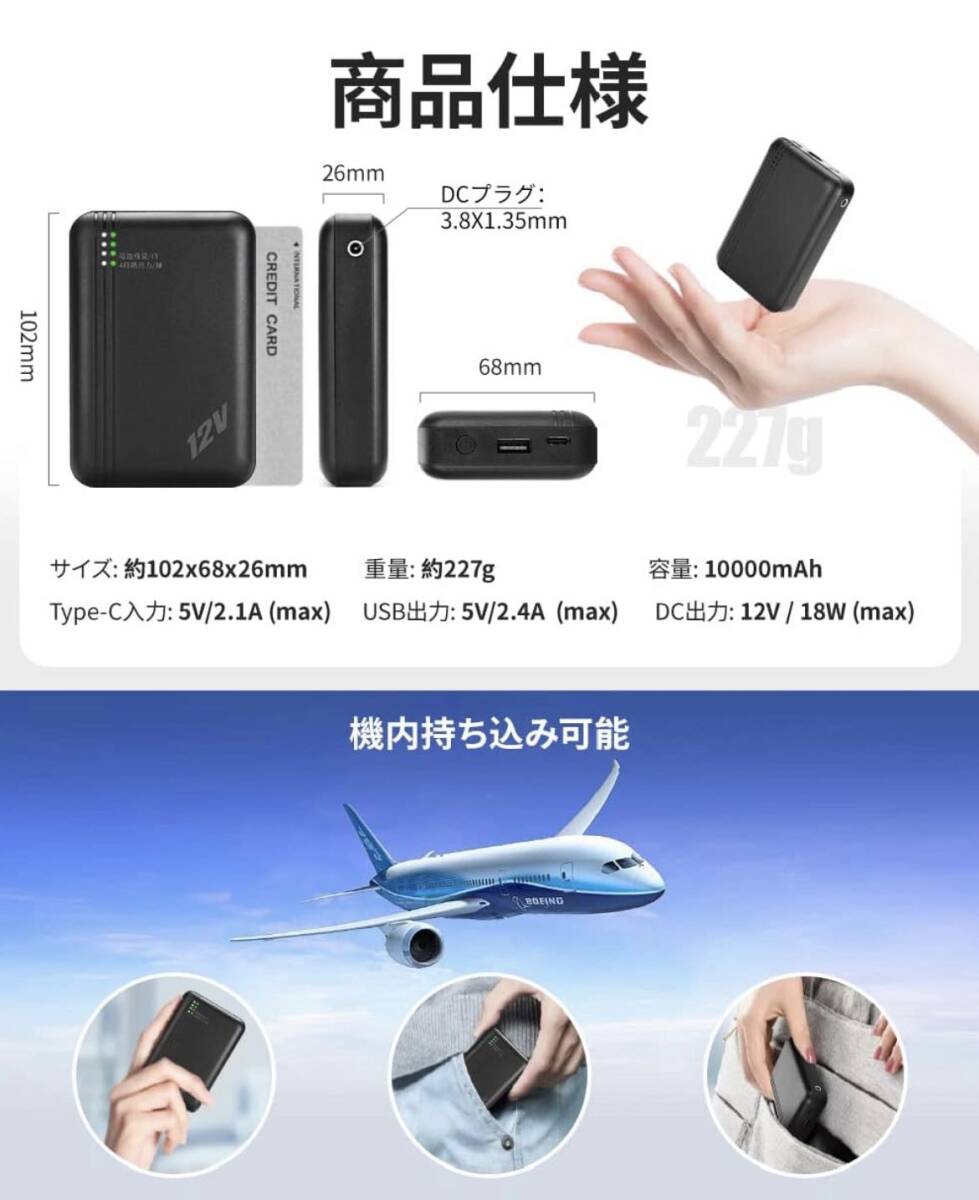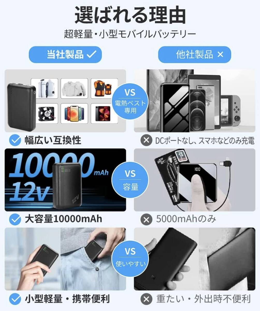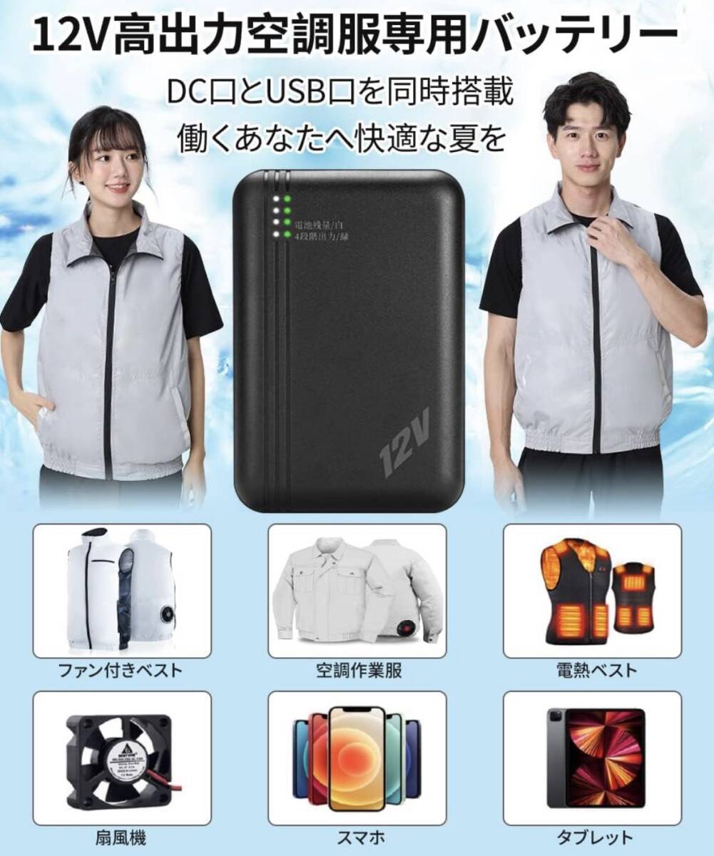 【電熱ベスト専用モバイルバッテリー★幅広い互換性】これは電熱服がON/OFF動作でも電源供給し続けるの電熱ベスト専用モバイルバッテリーです。無停止給電源モードを搭載しているので、面倒な電源ケーブルの抜き差しが不要です。電熱ベスト、電熱ジャケット、電熱パンツ、電熱ソックス、電熱グローブなどの長時間の連続作業や待機の電熱製品に適した。5V / 2Aモバイルバッテリーは市販されている加熱服の99%以上と互換性があります。軽量でコンパクトサイズは電熱服のポケットに入れても行動の邪魔に全然なりません。また、使わないときは、スマートフォン、タブレット、ノートパソコンなどの様々の機器を急速充電できます。