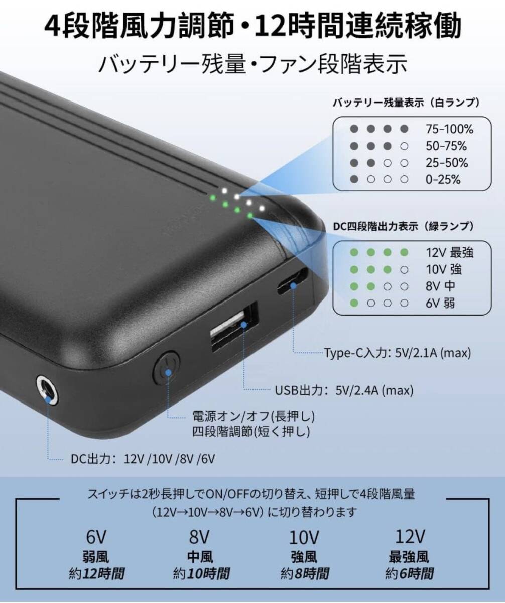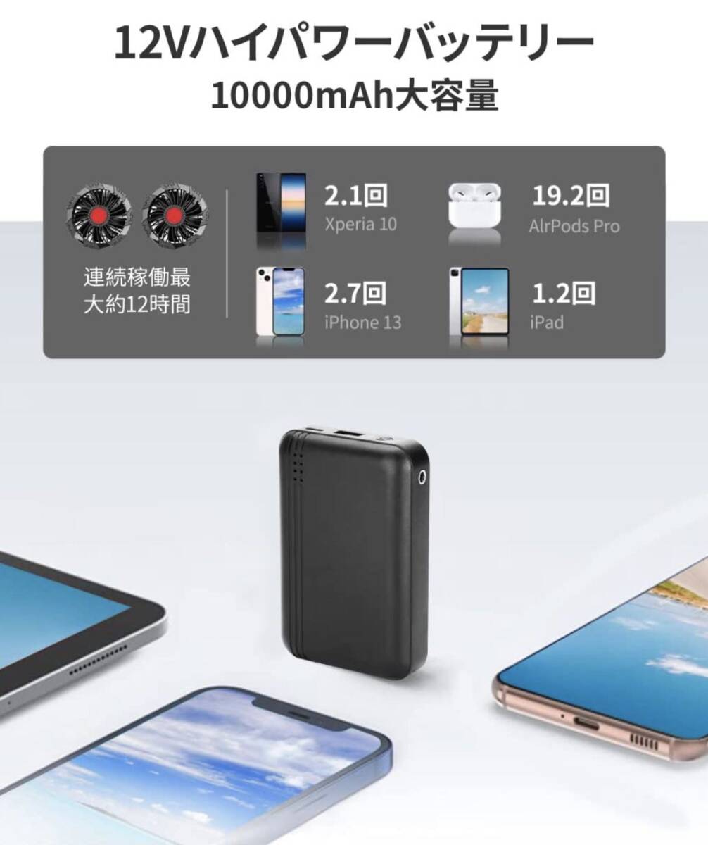 【10000mAh大容量★長時間給電可能】電熱作業服専用電池は10000mAhの大容量を搭載し、電熱ベストへ給電の連続稼働時間も長いです。iPhone 13に約3.2回、iPad に約1.2回、Galaxy に約2.1回、その他ほとんどのスマートフォンに複数回の充電が可能です。10000mAhの大容量モバイルバッテリーなので、スマホの充電切れを心配することはありません。