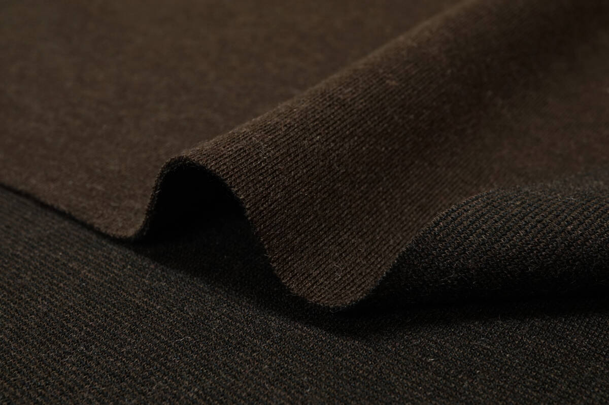 アクリル65% ポリエステル19% ウール16%、厚さは中厚地、巾方向に少しストレッチがあり、柔らかソフトな風合いで、ウール混ですがチクチク感も無く、しっとり暖かみのある肌ざわりでございます。また、表糸に抗ピリングタイプのアクリルウール混紡糸を使用しているため、毛玉が発生しにくくなっております。