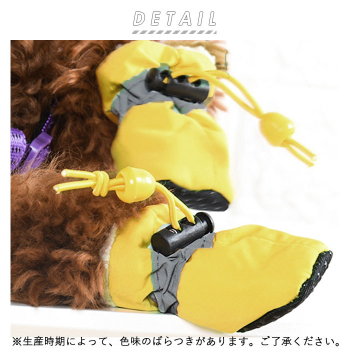 | 商品説明 | ・デリケートなワンちゃんの足元を保護する、ドッグシューズ。 ・足首をドローコードで留めることができるから、脱げにくく歩きやすい◎ ・内側はソフトな素材を使用しており、肉球を傷つけずワンちゃんの足元を守ってくれる。程よい保温性もあり、秋冬時期の防寒用にもオススメ。 ・靴底に滑り止め付きで、室内はもちろんお散歩時も安全。 ・表面に撥水性のある素材を使用しているので、雨の日も足を汚さずお散歩できる。さらに夜のお散歩も安心の反射テープ付き。 ・トゲやガラス等による傷や夏のアスファルト焼け、ほこりや汚れ防止、冬の凍傷予防などに最適。(※生産時期によって、色味のばらつきがあります。ご了承ください。) |
