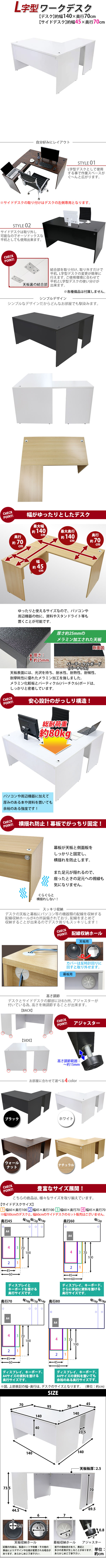 | 商品紹介 | ■作業スペースを広く確保出来る、L字型ワークデスクです。 ■サイドデスクの幅が約45cmのタイプです。 ■会議室や事務所等、オフィス家具として様々なシーンでお使いいただけます。 ■天板には、メラミン加工を施しています。 ■幕板が天板と側面板をがっちりと固定!横揺れを防止します。 ■ネジ穴隠しのシール付き。(サイドデスクのみ付属) ■デスクの天板と幕板に配線収納ホールが2カ所ずつ備わっています。 ■アジャスターで高さの調節が可能です。(高さ調節範囲〜約15mm) ※こちらの商品は、組立て式です。組立てにはプラスドライバーが必要です。お客様でご用意ください。 ※組立図が付属します。 ※サイドデスクの取り付けはデスクの左側専用となります。 ■材質:パーティクル(パーチクル)ボード(メラミン加工)(本体、サイドデスク)、プラスチック(アジャスター、配線収納ホール) ■重量:約48kg(デスク:約35kg、サイドデスク:約13kg) ■総耐荷重:約80kg ●新品商品ではありますが、輸入商品の為、多少の擦り傷などがある場合がございますので、ご納得の上ご購入下さいませ。 ●ご購入後、お客様ご都合によるご返品、ご返金等は一切お受け致しておりません。 ●本商品を使用した際に発生したトラブル、事故につきまして、当社は一切の責任を負いません。ご使用に関しましては、全て自己責任にてお願い致します。 ※カラーはホワイトとなります。 |