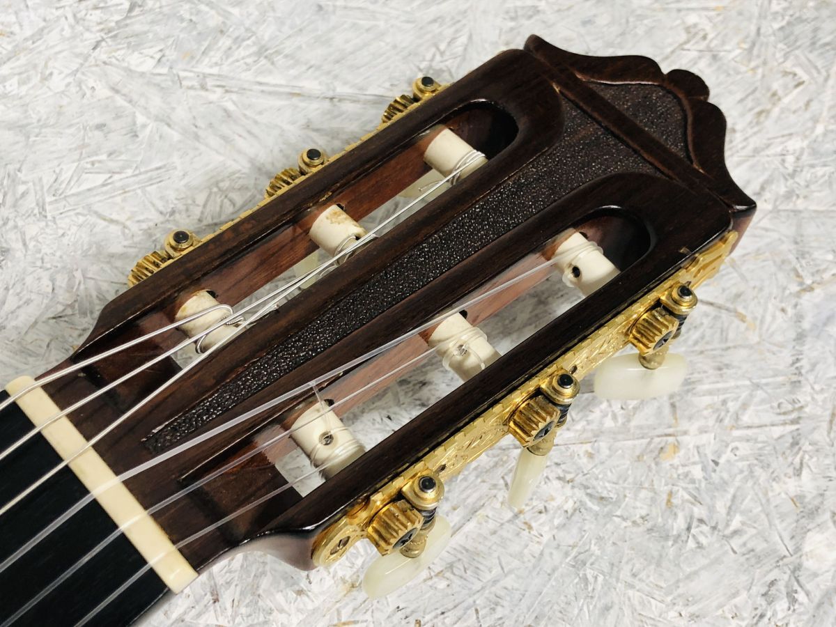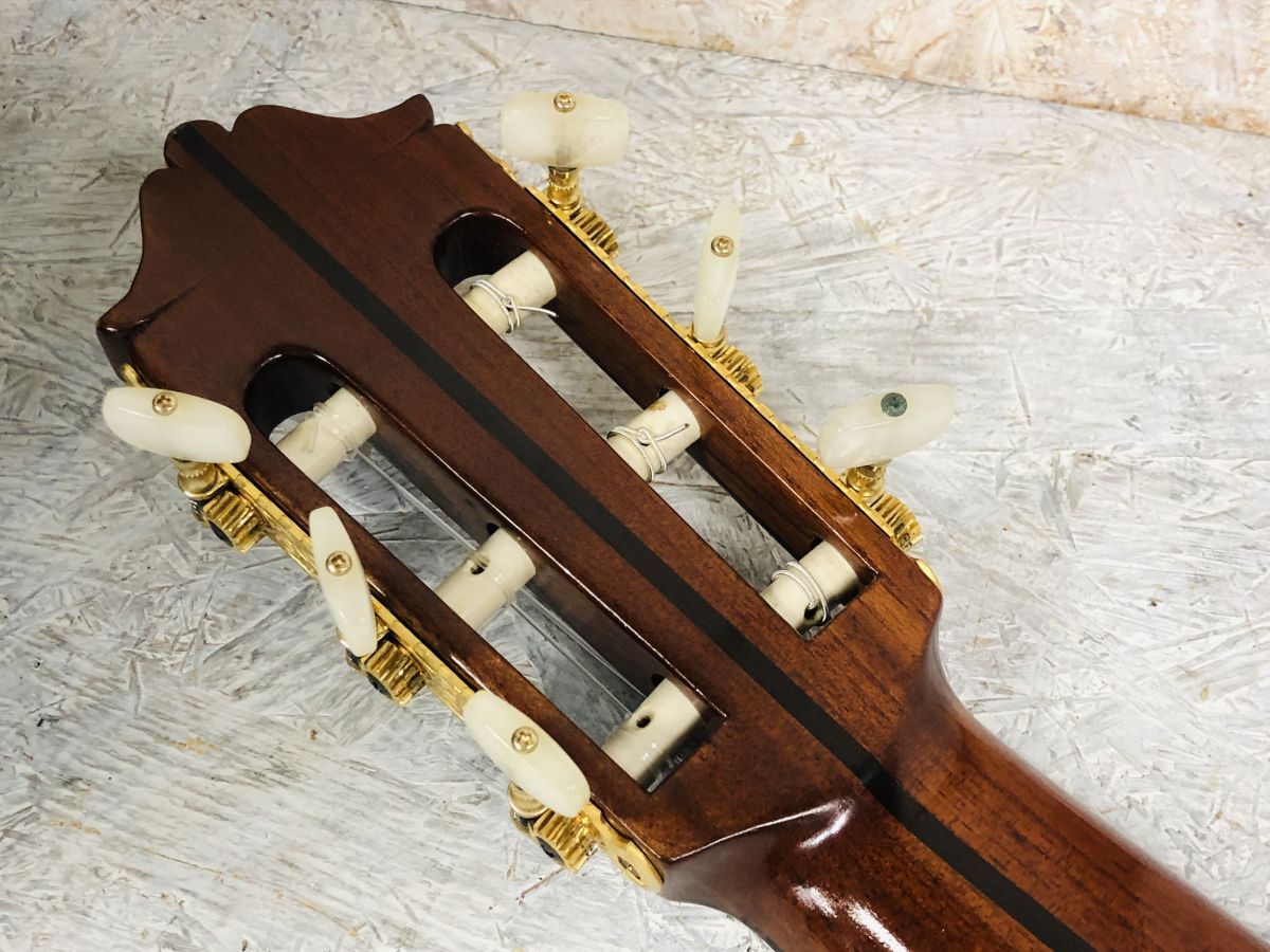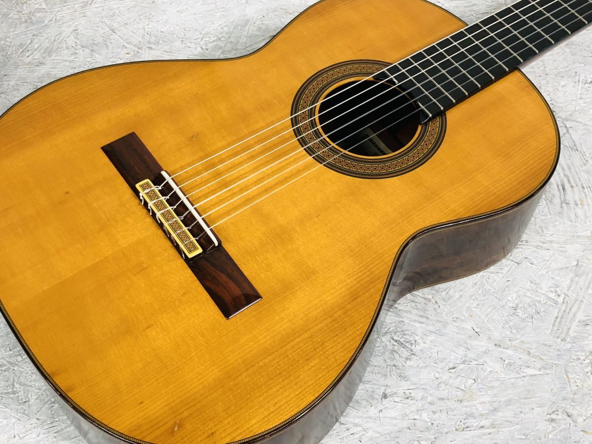 状態 : 傷、使用感があります。ヒール部の塗装が溶けた形跡があります。現在ベタベタはしてませんが、凸凹した感じです。ネックはやや順反りしています。トップ変形も少々あります。弦高は高めで6弦12フレットで約5.2mm。トップのブリッジからエンドにかけて3ヶ所、1~3cmほどのクラックがあります。内部に補修の跡はありません。現状お渡しとなります。