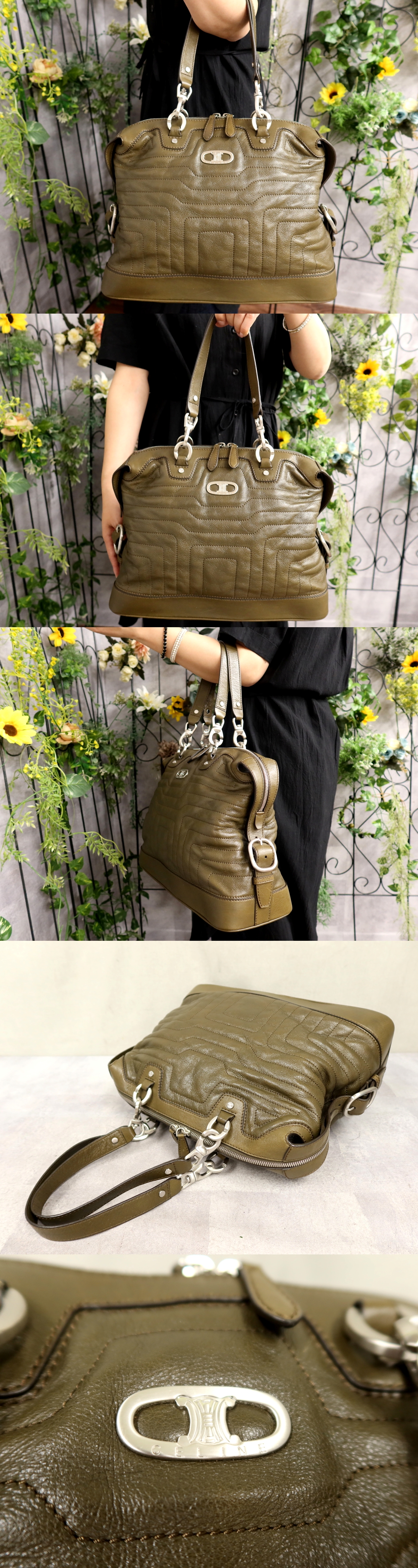 ●超美品●CELINE セリーヌ●ロゴ金具●カーフ レザー 本革●トート ハンド バッグ●カーキグリーン●シルバー金具●B5 収納 書類●Js57918