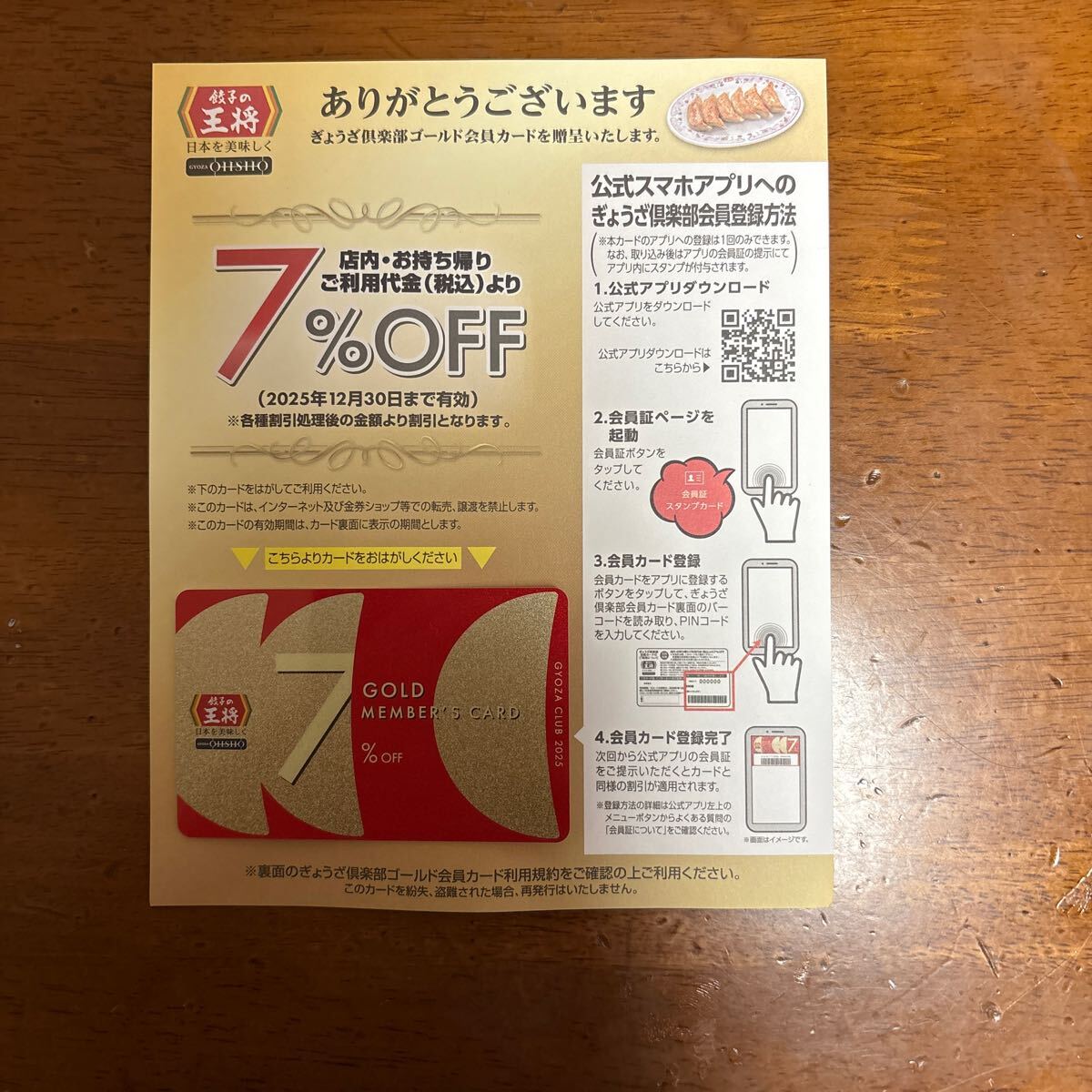 餃子の王将  ゴールドメンバーズカード 7%OFF 2025年12月30日まで有効