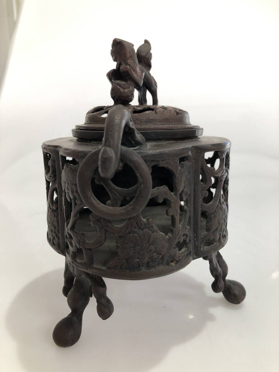 | 商品名 | 大明宣徳年製 香炉 茶道具 香道具 置物 三つ足 玉乗り獅子摘 透かし 金属工芸 |
