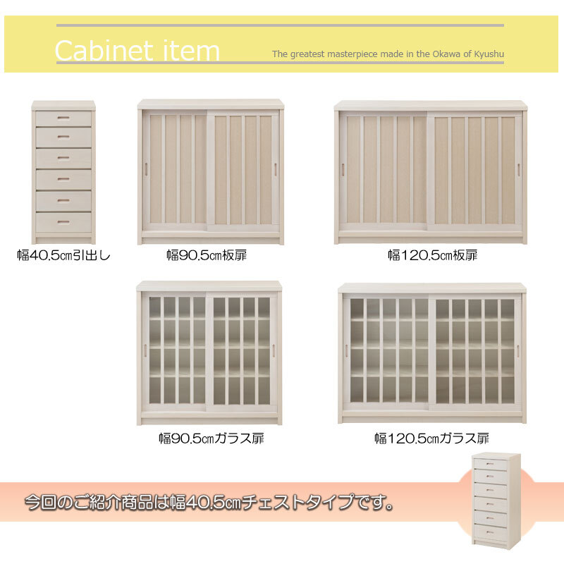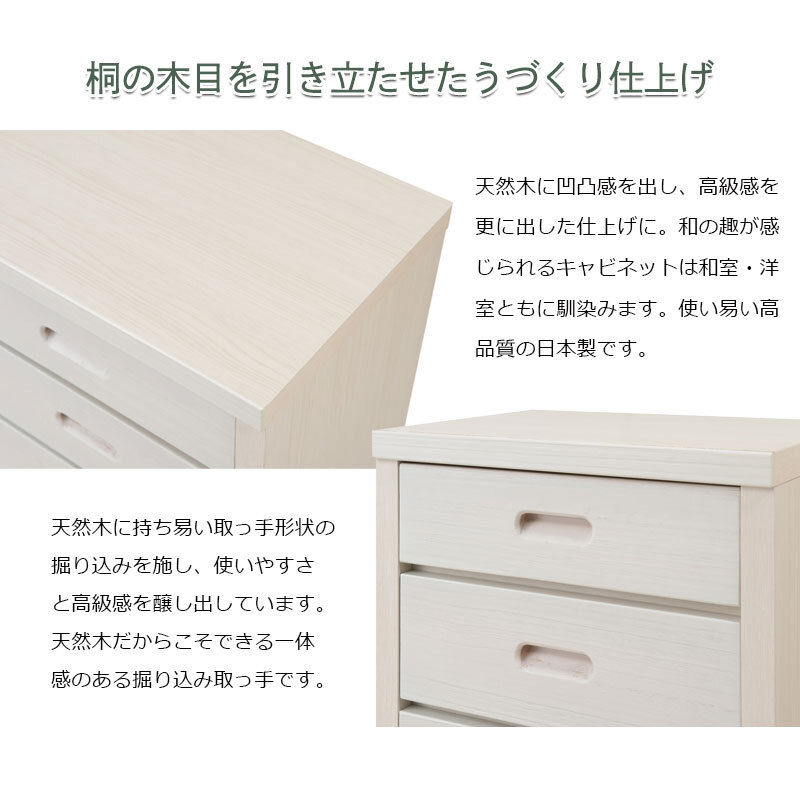 ■商品について/長く使える品質と高級感漂うデザインの【白雪】シリーズが新登場!桐の木目を引き立たせたうづくり仕上げ、職人が組み上げた、日本製の完成品ならではの洗練されたデザインが魅力的なリビングキャビネットシリーズです。和室はもちろん、洋室でも違和感なくお洒落なお部屋を演出してくれます♪スリムなのにしっかりと小物を収納する事ができます。細かく分かれた6杯の引き出しが、色んな小物を小分けして整理できるので便利です。幅も約40.5とスリムでちょっとした隙間にも置けます。他のシリーズと合わせて、リビングや寝室で存在感が引き立ちます。しっかりとした箱組みの構造で、長くお使い頂けます。