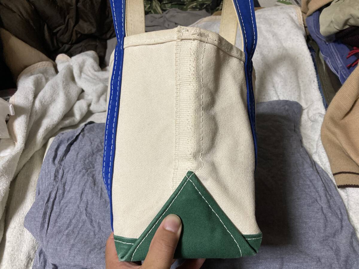 生成りベースに持ち手がロイヤルブルー、底部分がダークグリーンの切り替えになります。