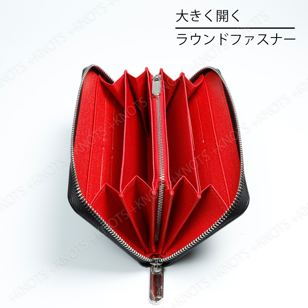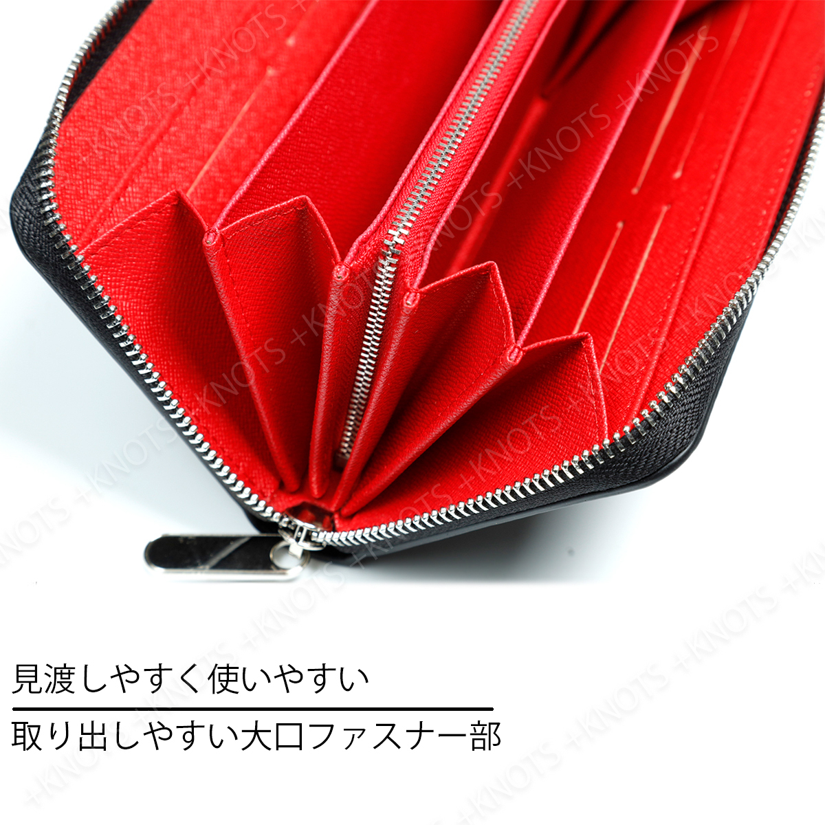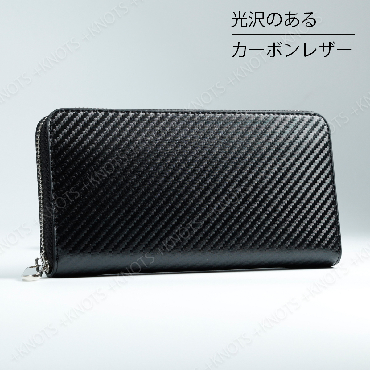 高級感のある独特な光沢が特徴の黒色カーボンレザーを使用した長財布です。表面の美しさに加え内部の異なるカラーとのコントラストも楽しむことができます。ファスナーを開けると大きく開くため全体を見渡しやすく、収納物の出し入れがスムーズです。また小銭入れのジッパーはL字型になっており、大きく開くため視認性が高く、小銭の取り出しも簡単です。使い勝手に優れ上質な素材とデザインでビジネスシーンからカジュアルなシーンまで幅広く活躍してくれます。