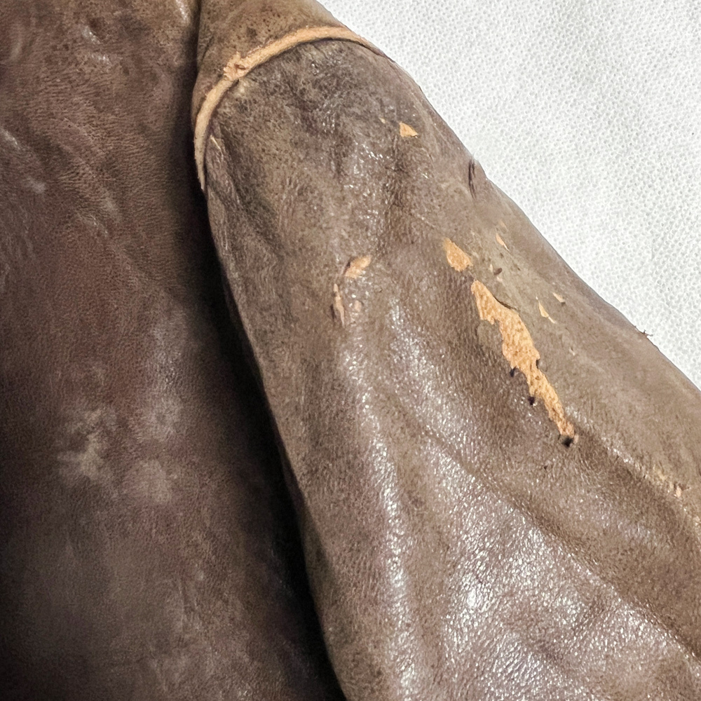 状態は全体的にスレや小傷、レザー特有のフェード感あり、左肩に小穴や剥がれなどのダメージあり、袖や裾にもスレと細かいダメージあり、バックアジャスターにリペアありですが、ライニングのウール部分は比較的綺麗な状態で、着用に問題のある様なダメージなく、古い慣れされている方には問題ないレベルのヴィンテージコンディションです。
