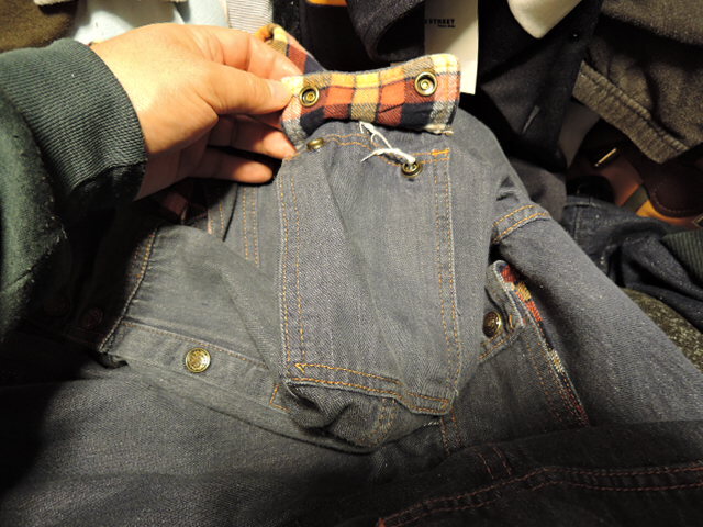 襟や袖口、フラップの裏にはカラフルなプリントネルが使われております。