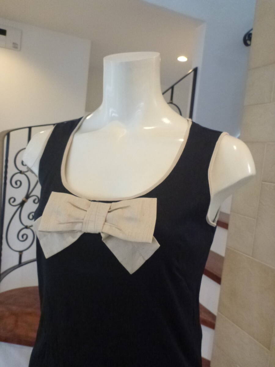 ◆黒×ベージュ バイカラー リボン ノースーブカットソー