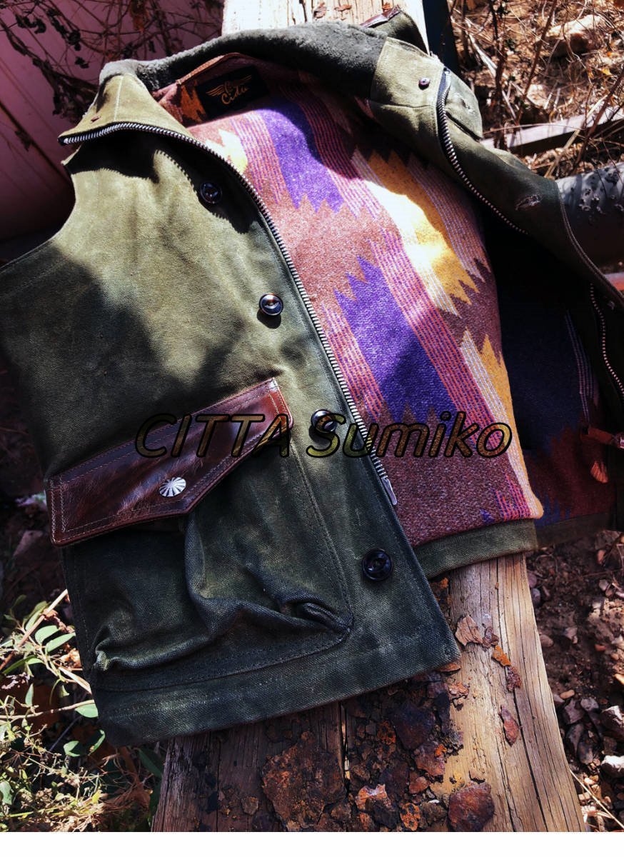 店長特選 人気美品★ 雰囲気抜群のコットンキャンバス×レザー×ナバホブランケットの裏地 ライダースベスト グリーン 本革 XL