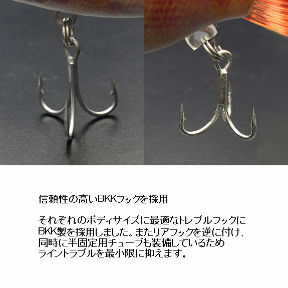 フックはささりと強度に定評のあるBKKフックを採用。内部も骨形状にリブを張り巡らし、強度も確保しています。