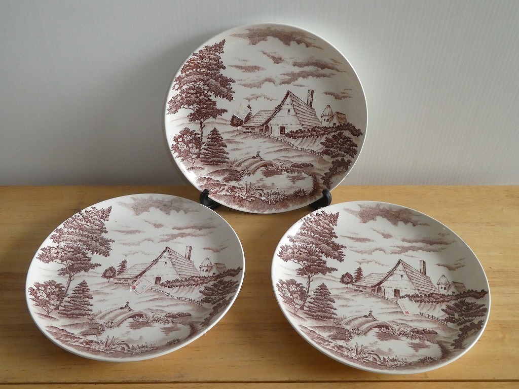 ●昭和レトロ 風景画 大皿 24.5㎝ プレート 皿 3枚 デットストック ヴィンテージ 日本製●