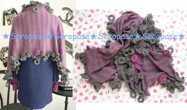 お花が沢山付いたカシミア100%のマフラーストールです。とっても可愛らしい♪カシミアの柔らかい肌触りが贅沢。お色ですが、紙タグにはフューシャになっておりましたがグレーとパープルの2色シマになります。
