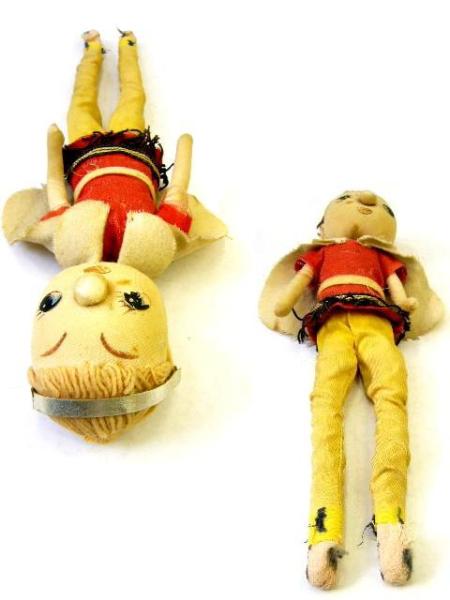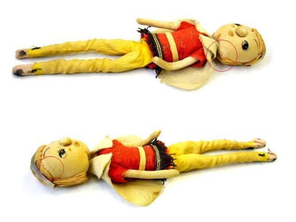 | 商品紹介 | 昭和30年代頃のものではないかと思われます。 写真でご覧のような状態です。 どなた様か補修して頂ける方にお願い致します。 目、口は紙シールの貼り付け 中身は柔らかな詰物にワイヤー入りで ポーズの変化が楽しめるようです。 頭部に糸紐があり下げられるように なっていたと記憶していますが 紐は失われているようです。 (写真は解り易いように複数の角度から写しています。1点の出品です。) 写真でご覧のように全体的にホコロビ、ヤブレ、ムシクイ穴があります。 大きなものとしてブーツがあったと思われますが 糊のムシクイで失われているようです。(写真参照) 顔、頬など表皮にホコロビあり詰め物が覗いています。(写真2枚目〇印参照) 頭部の紙リングの両端が切れています。 古いものですので経年の色褪せ、シミ、ヨゴレ、キズ ホコロビ、ヤブレ、塗料の落ちなどがあります。 使える部位も多数あると思いますので パーツ取りやレストア用などにご自分で工夫出来る方 中古のジャンク扱いでお取り引き出来る方にお願いします。 見落とし、書き落としもあろうかと思いますので 状態、欠品などは画像にてご判断下さい。 写真のものが全てです。 写真でご判断下さる様お願い申し上げます。 落札時に出品者からのメッセージが届きますのでご覧下さい。 (マイオークションの通知設定を非通知にしている場合は届きません) メールが届かない場合はお手数ですがご連絡下さい。 落札後のキャンセルはお受けできません。 |