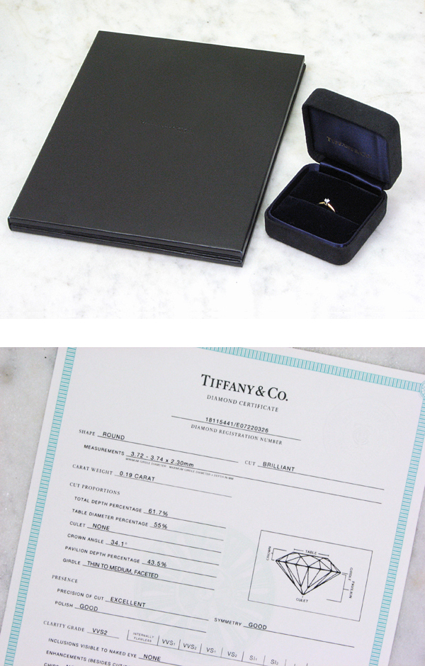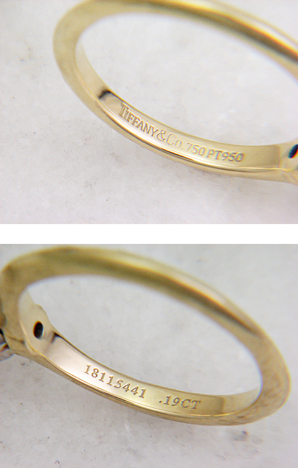 | 特徴 | 0.19カラットのダイヤモンドにプラチナ爪付の18金リングです。とてもゴージャスな指輪で、まさに一生物です。ティファニー社の保証書付。「No.18115441」「PT950」「750」「.19CT」の刻印あり。 | ||