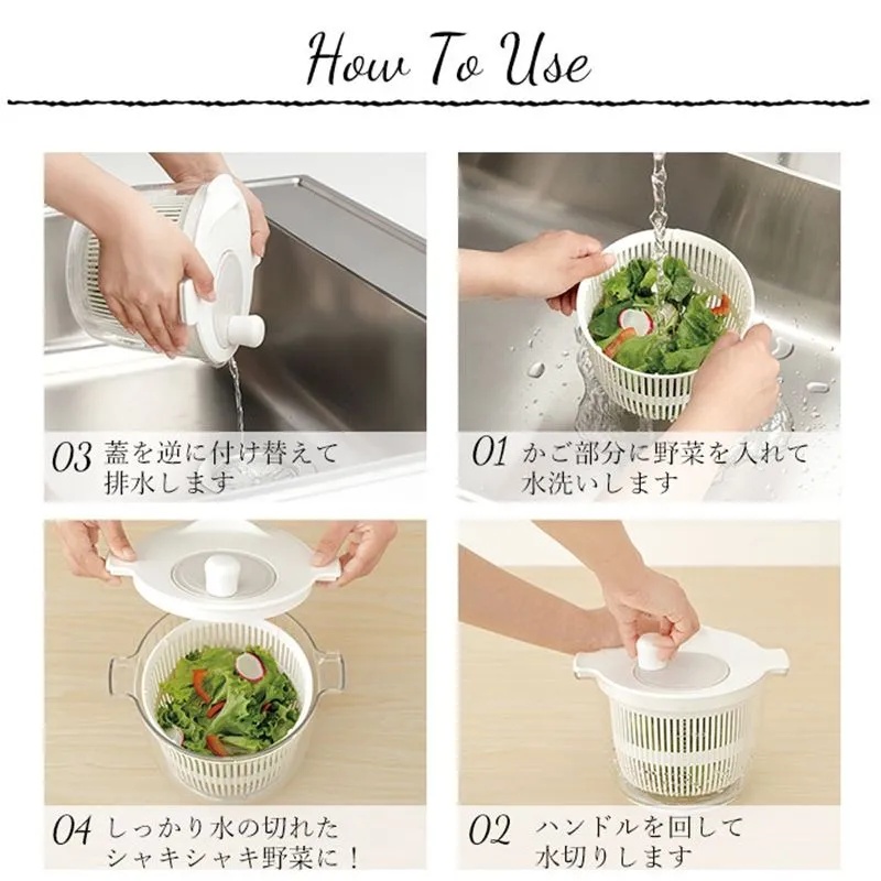 ・使い方は、まず「水切りかご」の中に野菜を入れて洗ったら、フタをしてハンドルを回すだけ!