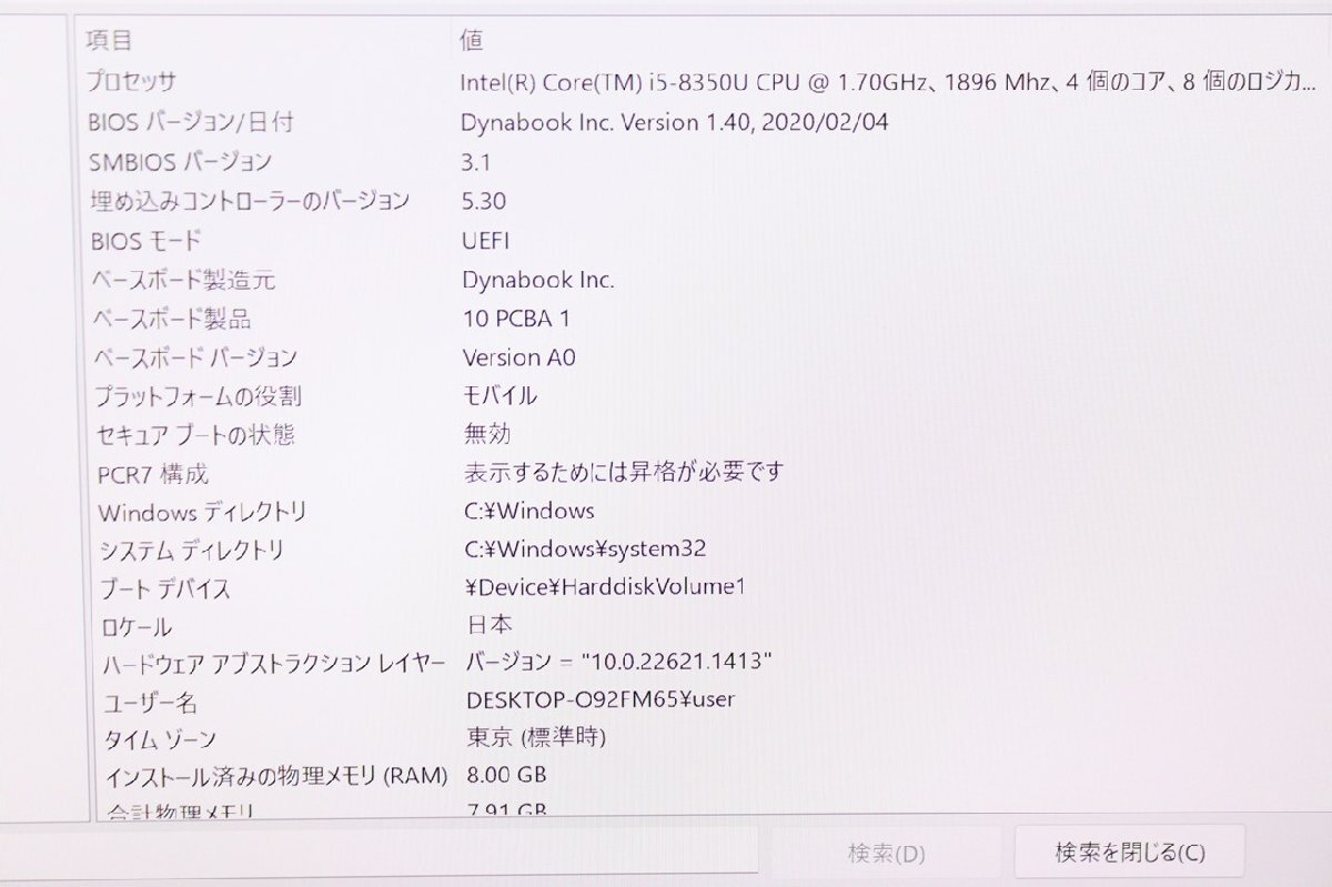 N 3【i5第8世代】TOSHIBA / dynabook S73/DP / CPU:core i5-8350U@1.70GHz /メモリ:8GB / SSD:256GB / Windows11 Pro
