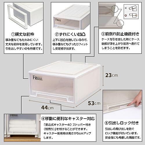 クローゼットの収納に最適な収納ケースです。引出しの飛び出しを防ぐロック機能付き。積み重ねてもたわみにくい丈夫な前枠が付いています。