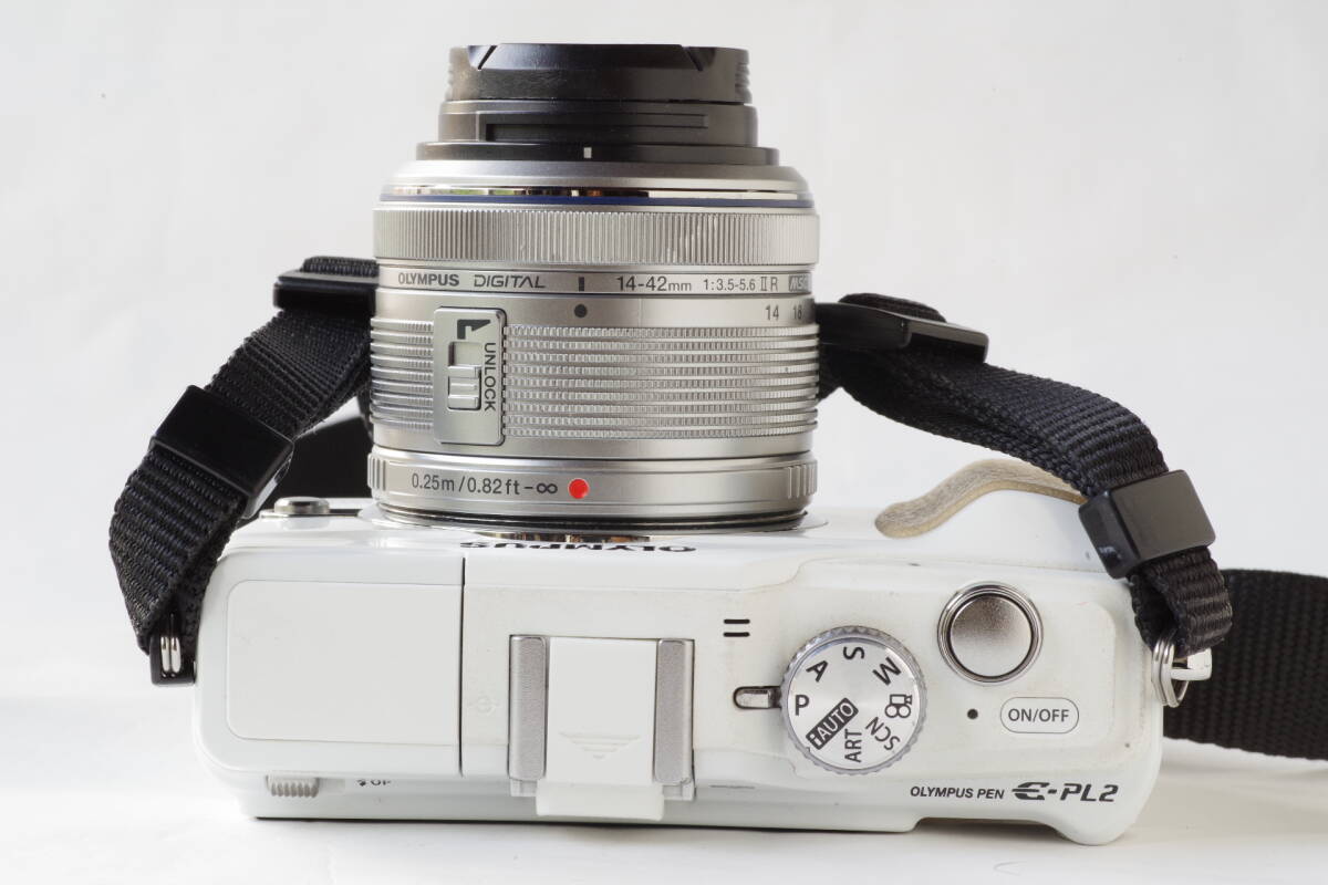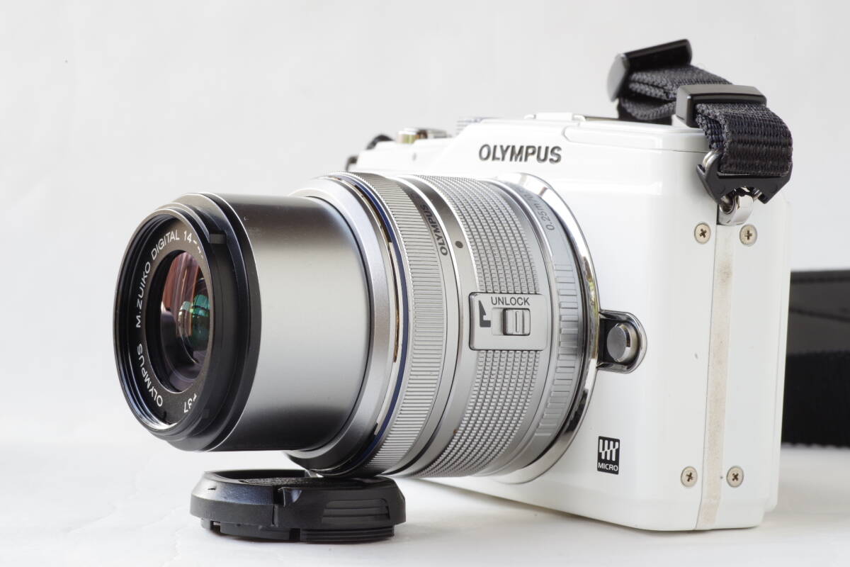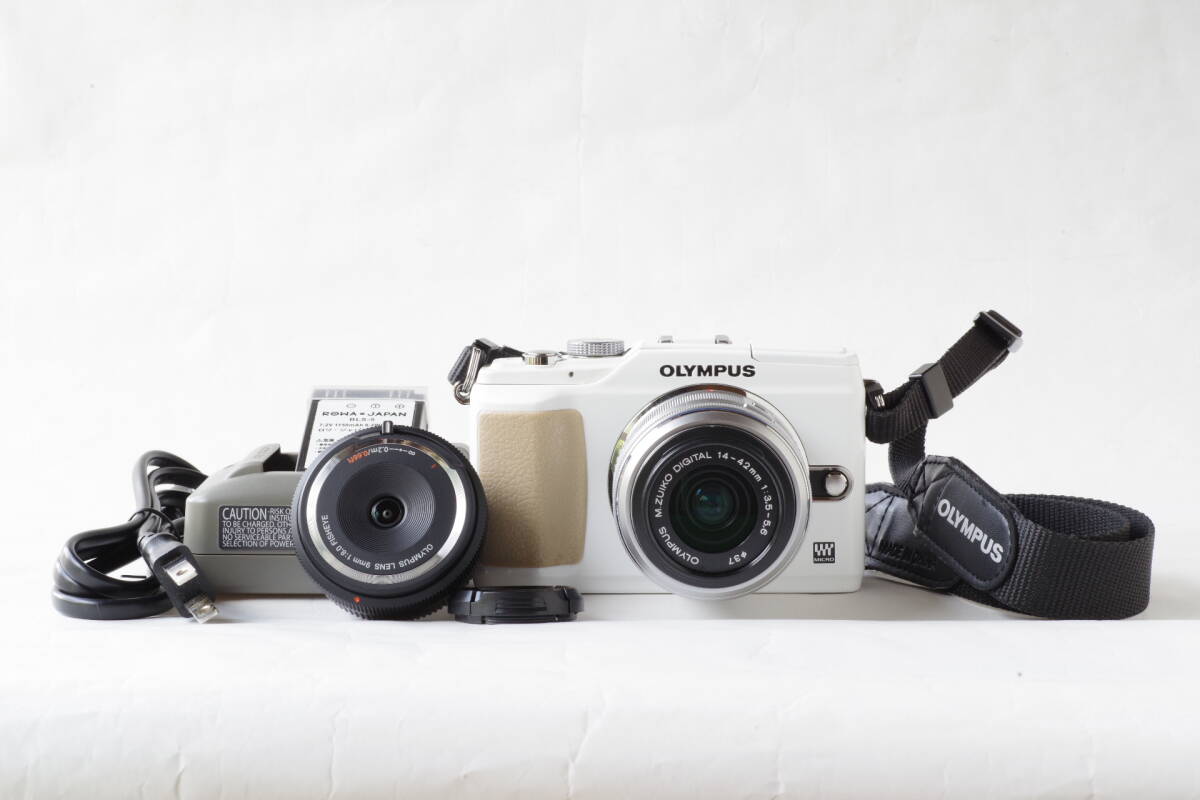 オリンパスの PEN Lite E-PL2 + 標準ズームレンズ + 魚眼レンズの出品です。