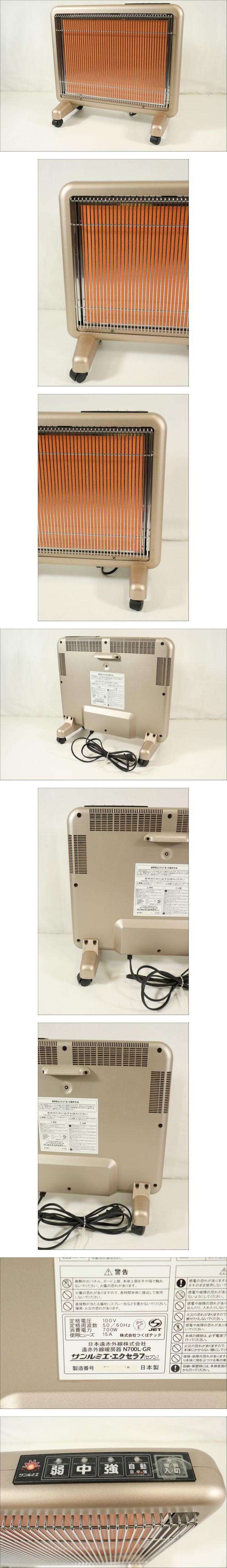 | 商品説明 | ★最後までお読みいただき、ご理解の上でのご入札をよろしくお願いいたします。 【JB003】 【動作OK】サンルミエ エクセラ7 N700L-GR ヒーター 遠赤外線暖房器 暖房器具_BJL_C0408-J019 【動作状況】 こちらは、Bになります。 A:動作確認OK(全ての機能が問題なく使用できるか保証できません) B:通電のみ確認(動作確認は行っていない為ジャンク品の可能性含む) C:動作未確認品(ジャンク品の可能性含む) D:不動品、ジャンク品 ※動作未確認の商品は保証出来ません。 【商品状態】 基本的に中古品の為、スレや傷・汚れなどございます。 多数商品がある場合、傷や汚れを写真に載せきれない可能性もございます。 あらかじめご理解・ご了承の上入札をお願いいたします。 また、細かくクリーニングしている訳ではありませんので 状態を極度に気にされる方、神経質な方は入札をお控えください。 ■写真に写るもののみの販売となります。 写真にないものは付属いたしません。 画像をご確認の上、商品の状態に納得して頂いた方のみ入札をお願いいたします。 【サイズ】 W約48×H約45×D約23cm ※素人採寸のため多少の誤差はご容赦ください。 【取引ナビの対応日時】 ■平日9:00-18:00となります。※土日祝日は休業 【発送方法】 発送は佐川急便よりお送りいたします。 原則ご入金後、発送まで3日~7日お時間を頂いております。落札商品の量によって発送までのお時間が前後してしまう可能性があります。商品をお急ぎの方はご注意ください。 ※発送元地域が異なる商品の同梱はできません。 また土日祝日はヤフオクの取引全般をお休みしておりますので発送/連絡はできません。いつ頃発送するのか等の催促はおやめください。 ※沖縄・離島の方は【中継料】が発生し送料が高額になります為、佐川着払いとなります。 ※中継料が発生した場合、追加で中継料分の不足送料を請求させて頂きます。必ずご自身のお住まいをご確認頂いてから入金をお願い致します。 【直接引き取り】 引き取り場所は埼玉県久喜市になります。 詳しいご案内場所は落札後、取引ナビにてご連絡いたします。 受付時間:平日9-18時 ■手順 ① 取引情報の入力 ② yahoo!かんたん決済で支払うをクリック ③ 配送方法を直接引き取り0円を選択し決済を行ってください。 ④ 取引メッセージに 直接引き取り希望と、希望日、希望時間帯をお知らせください。 後程、ご案内の通知をいたします。 【注意事項】 ■発送連絡と同時に評価も入れております。評価不要の方はご落札時にメッセージでお知らせください。 ■商品到着後、破損があった場合は配送業者へ一度ご連絡をお願い致します。 ■発送方法の変更はお受けできません、また送料に納得がいかないままの入札はご遠慮ください。 ■商品到着後7日以上経ってからの返品・返金は対応出来ません。品物が到着次第すぐに商品の状態をご確認ください。 ★他にも沢山の商品を出品しております。 ご興味のある方は、他の商品も是非ご覧下さい。