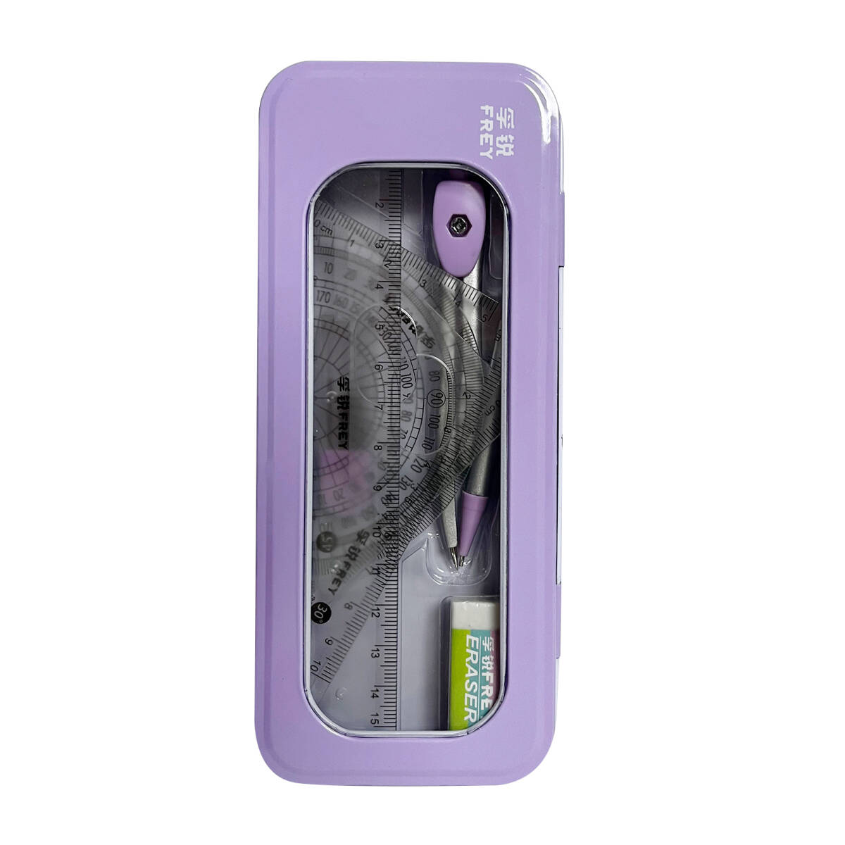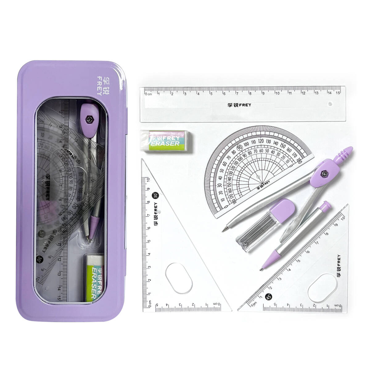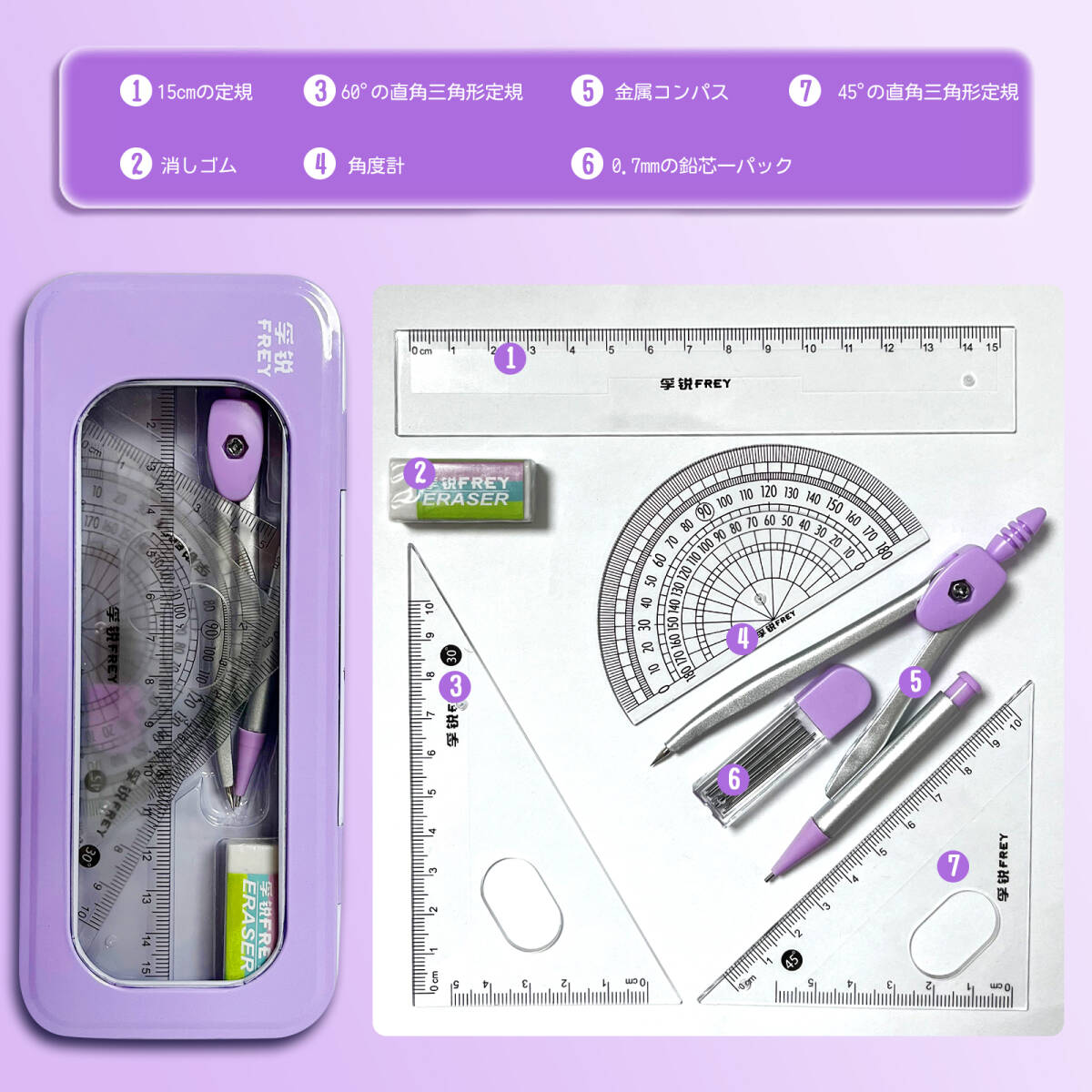 | 小学生専用の7点文具セット | 金属製コンパス、15cm定規、分度器、45°三角定規、60°三角定規、消しゴム、0.7mm芯ケースをコンパクトにまとめたセット。学習や宿題に最適! |