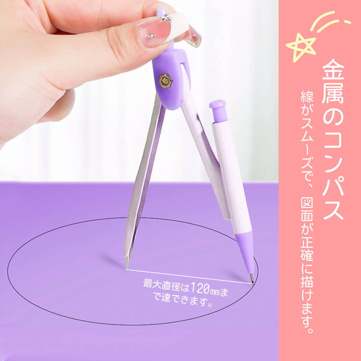 | 安全・使いやすさ重視 | 金属コンパスは滑り止め機能付きで、安全かつスムーズな操作が可能。三角定規や分度器も、小学生でも使いやすいように設計されています。 |