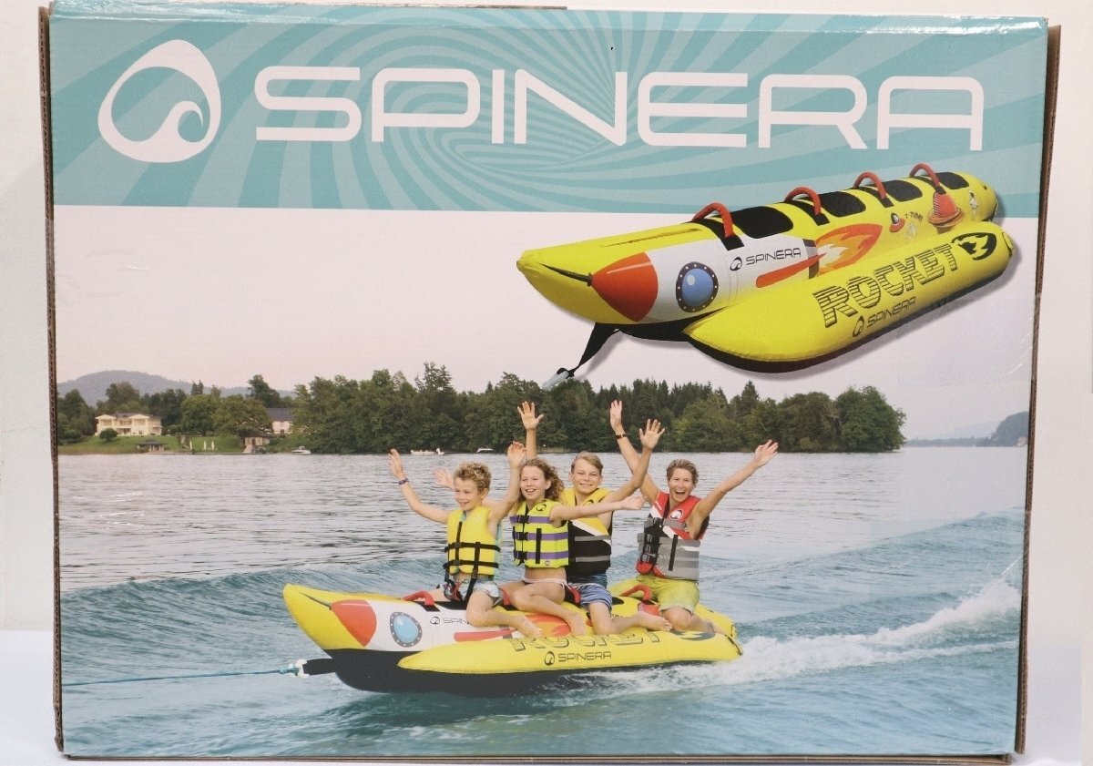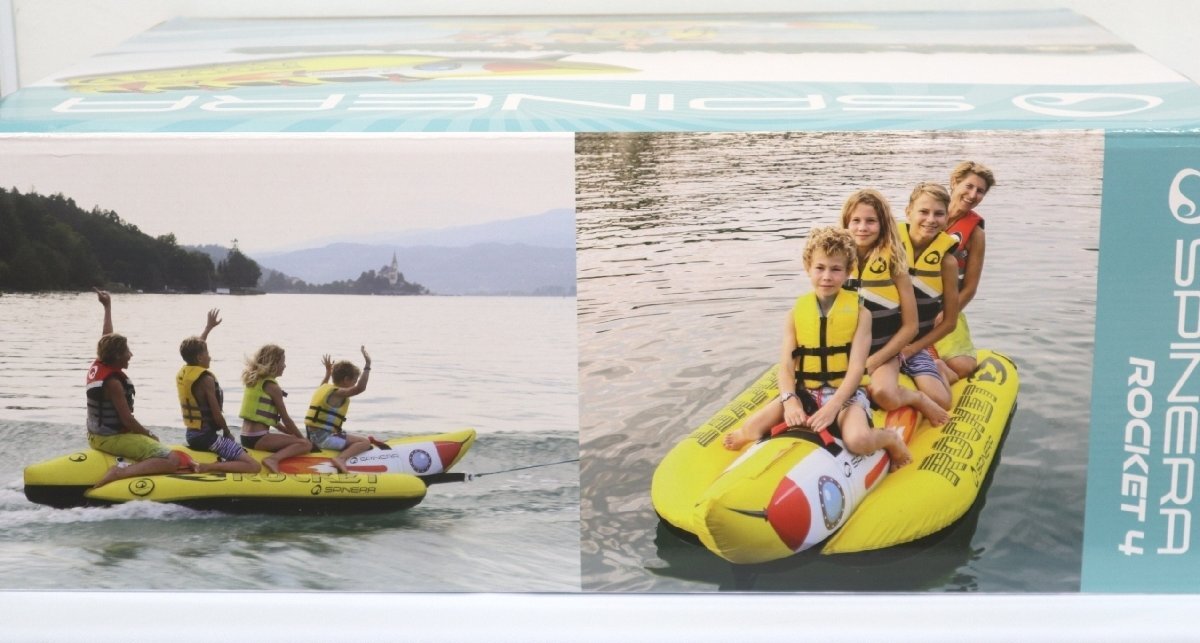 ![]() | ロケット4(エアー注入タイプ)は水上でご使用いただくバナナボート型チューブです。低速にて安定したライディングをファミリー(子供から大人まで)でお楽しみいただけます。 |