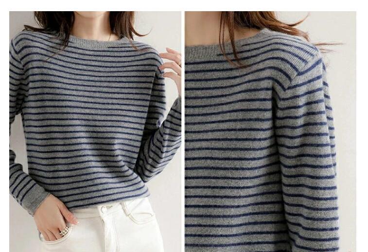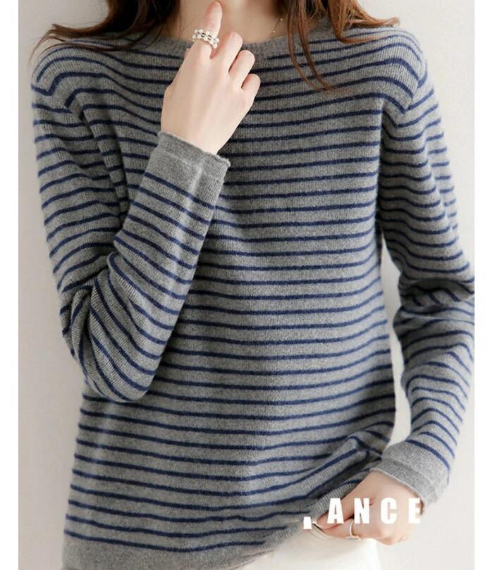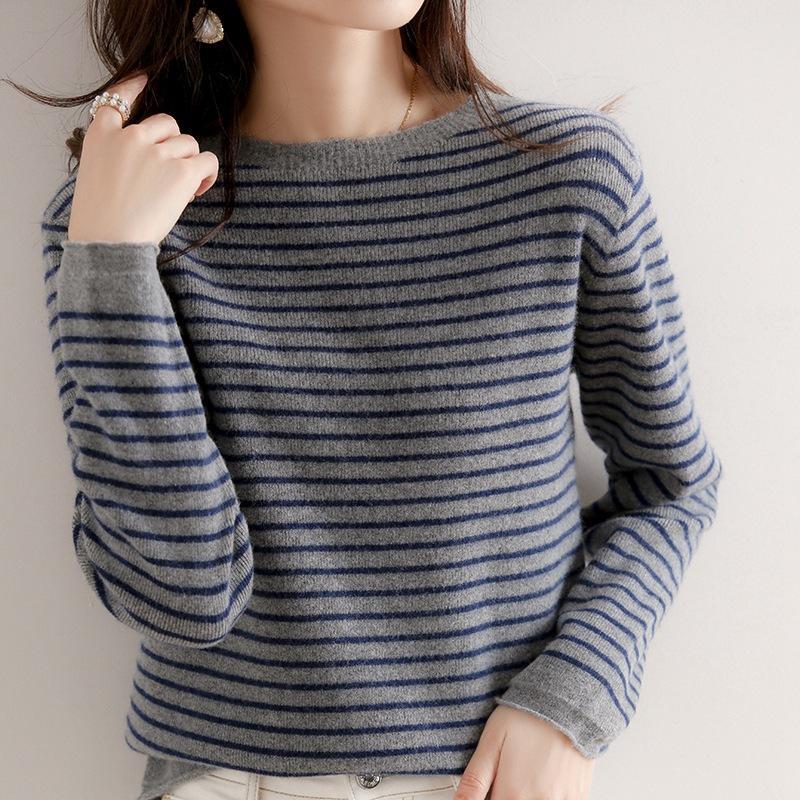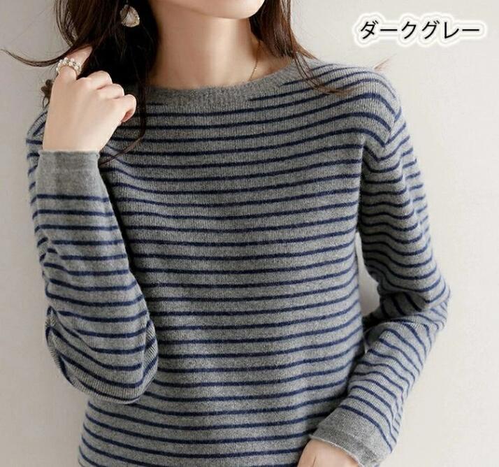 トップス tシャツ ニット クルーネック ストライプ レディース 秋冬 カットソー セータ きれいめ 履きやすい (ダークグレー Mサイズ)