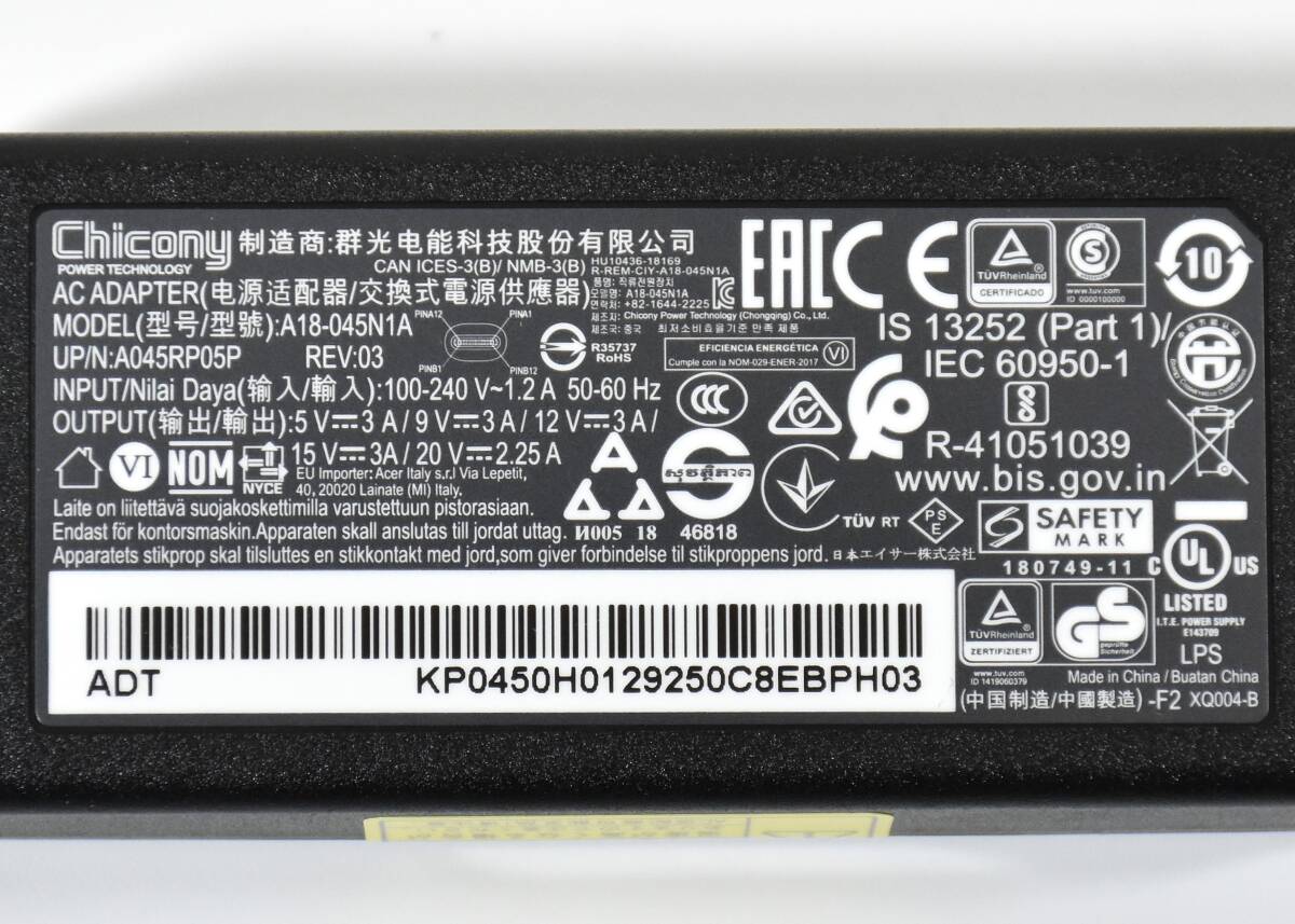 5V-3A / 9V-3A / 12V-3A / 15V-3A / 20V-2.25A 最大出力45W |
