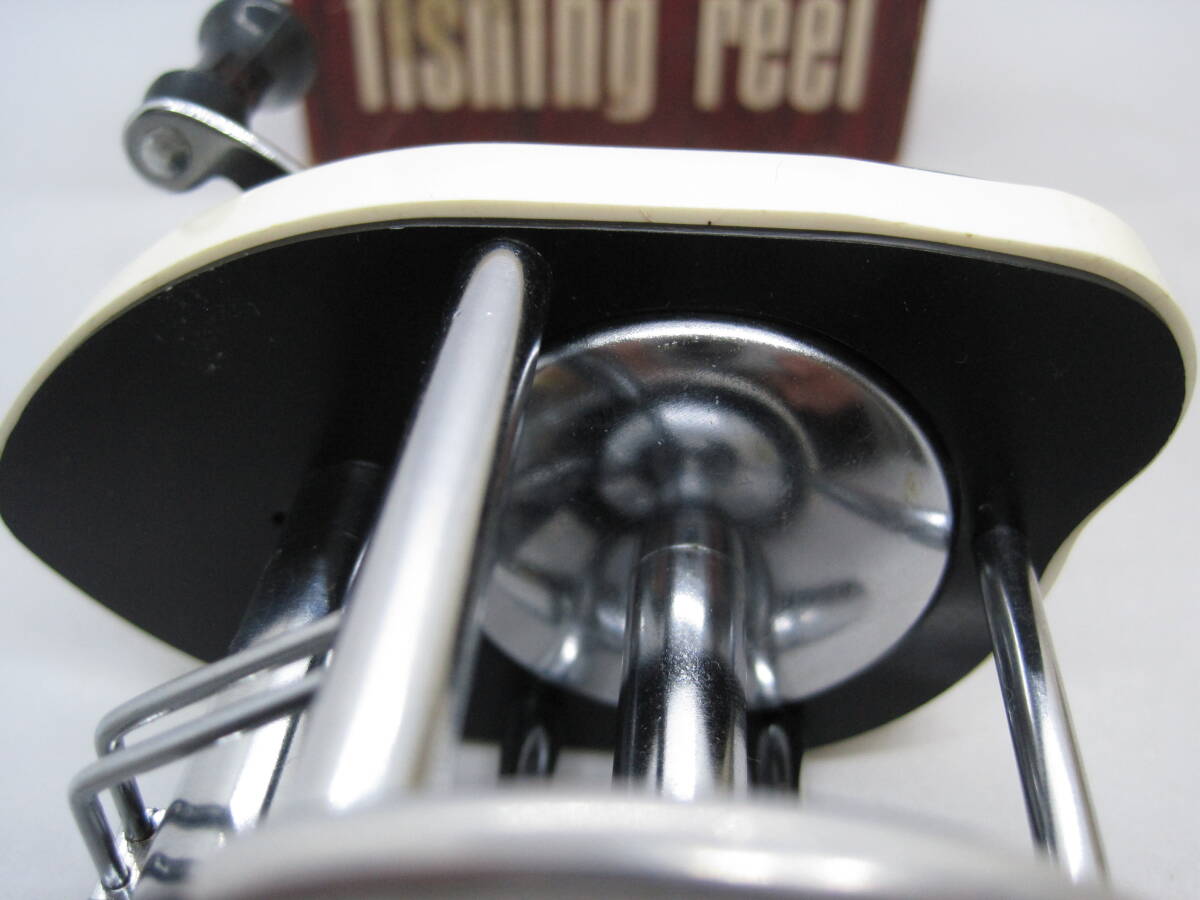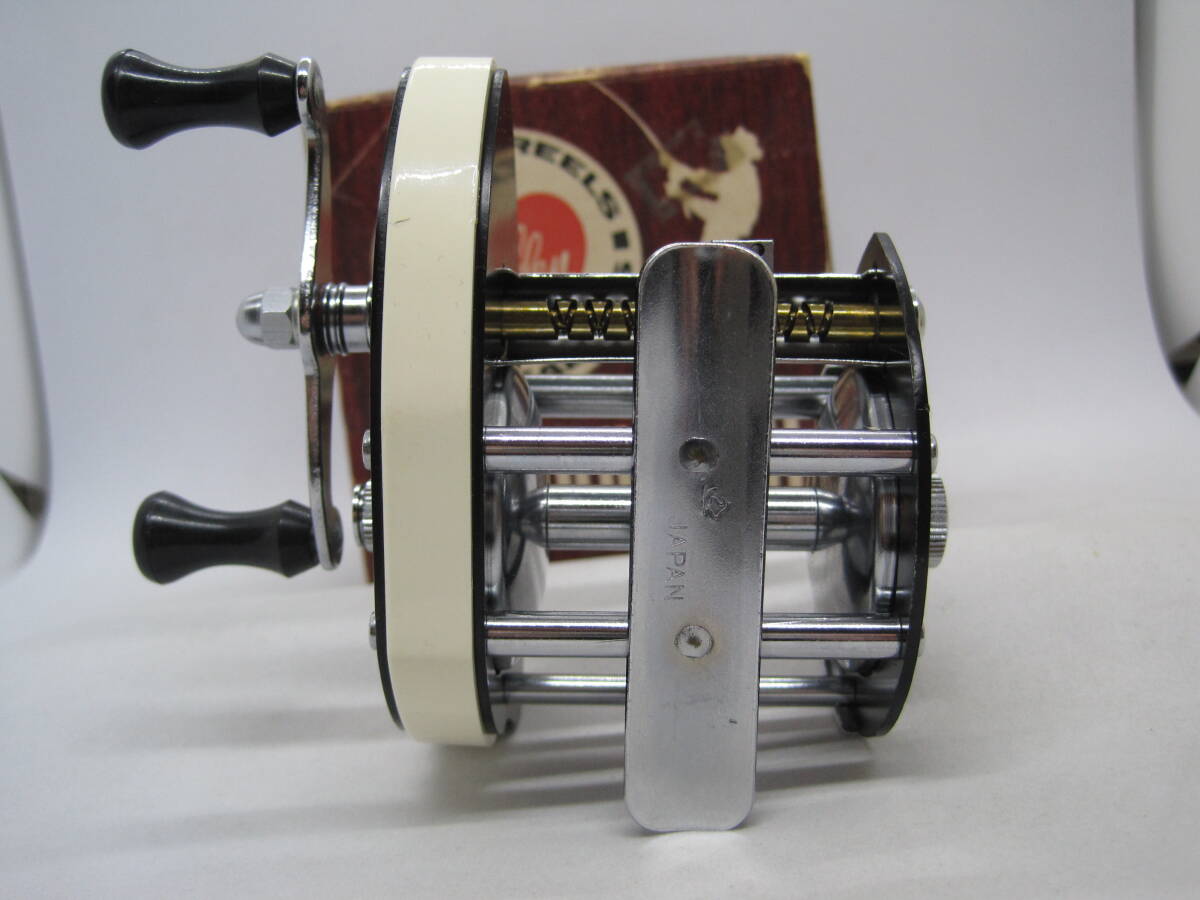- 非常にユニークな形をしたこのリールは、日本製で、恐らく1970年代に製造されたものと思われます(フート裏に“Japan”の刻印あり)。
