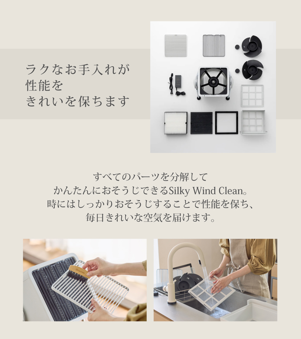 | 主な機能 | ファンガード・ガードサポート・スピンナー・アッパーファン・ロウワーファン・フィルターケース・フィルターケースカバー・プレフィルターの 脱着・洗浄(水洗い) 明暗センサーによるインジケーター減光ならびに Normal(ノーマル)モード時、Silent(サイレント)モード風量運転 メモリー機能(前回設定した状態で運転開始) 安全機能(ファンガード・フィルター未装着・電源ON時取り外した場合、警告音+運転停止) |