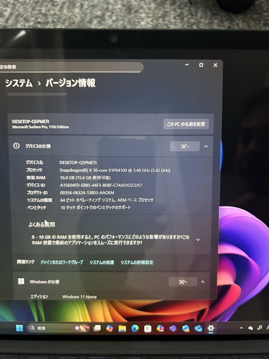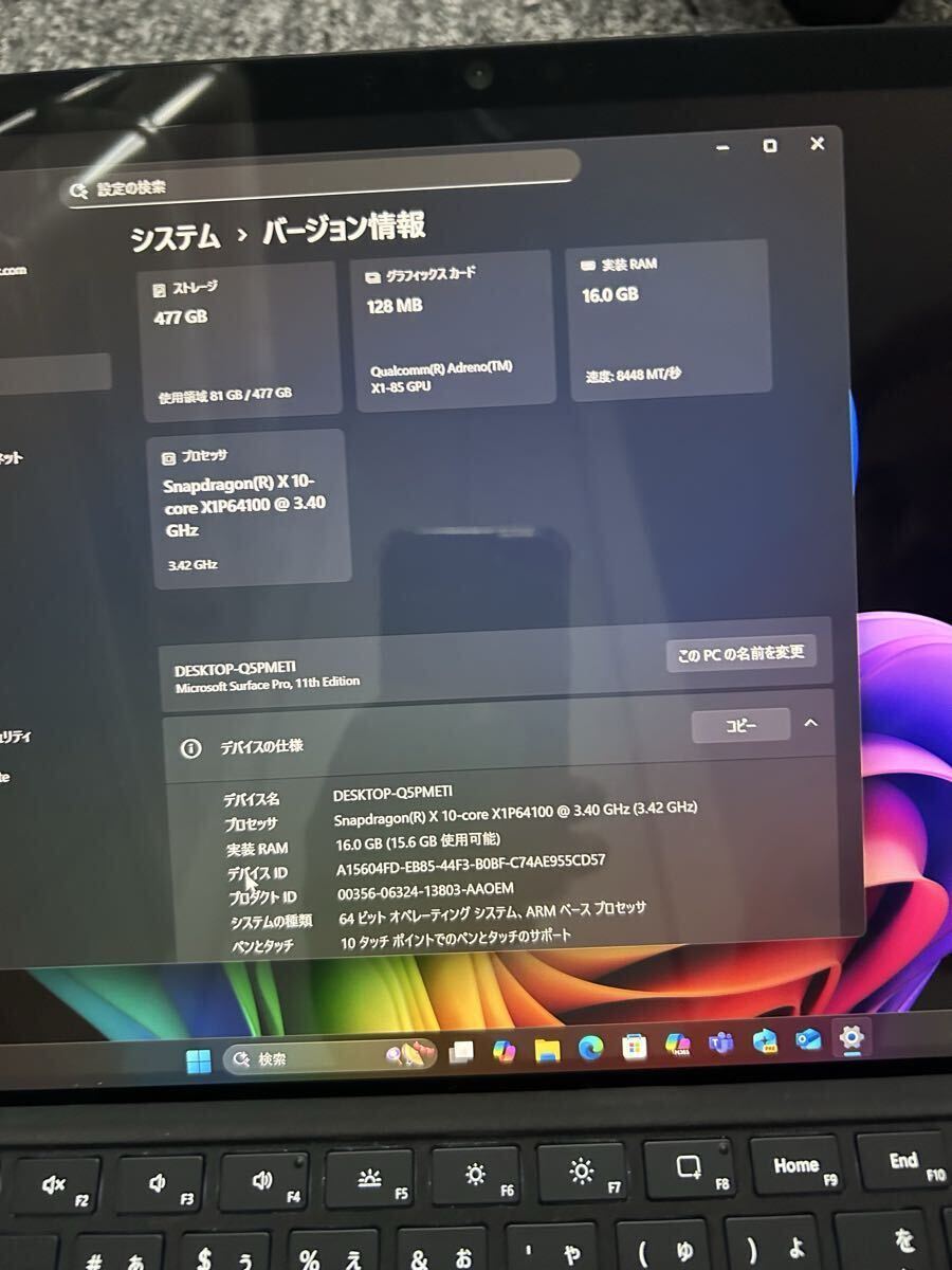 Microsoftの最新モデル「Surface Pro 11th Edition (Snapdragon X Elite X1P64100)」です。