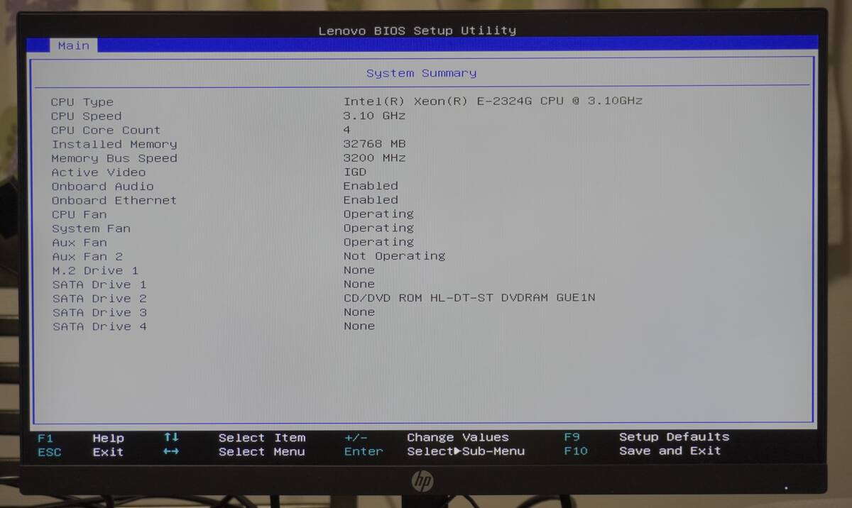 ・BIOS起動を確認(写真あり)。CPU/メモリを認識、光学ドライブをSATA Drive 2として認識、M.2/SATAドライブはNone表示。