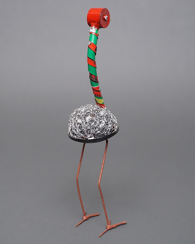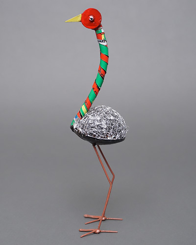 マリ共和国で使用済みの缶や鉄製タワシを再利用し、遊び心ある鳥のフォルムに仕立てたリサイクルアートの置物です。