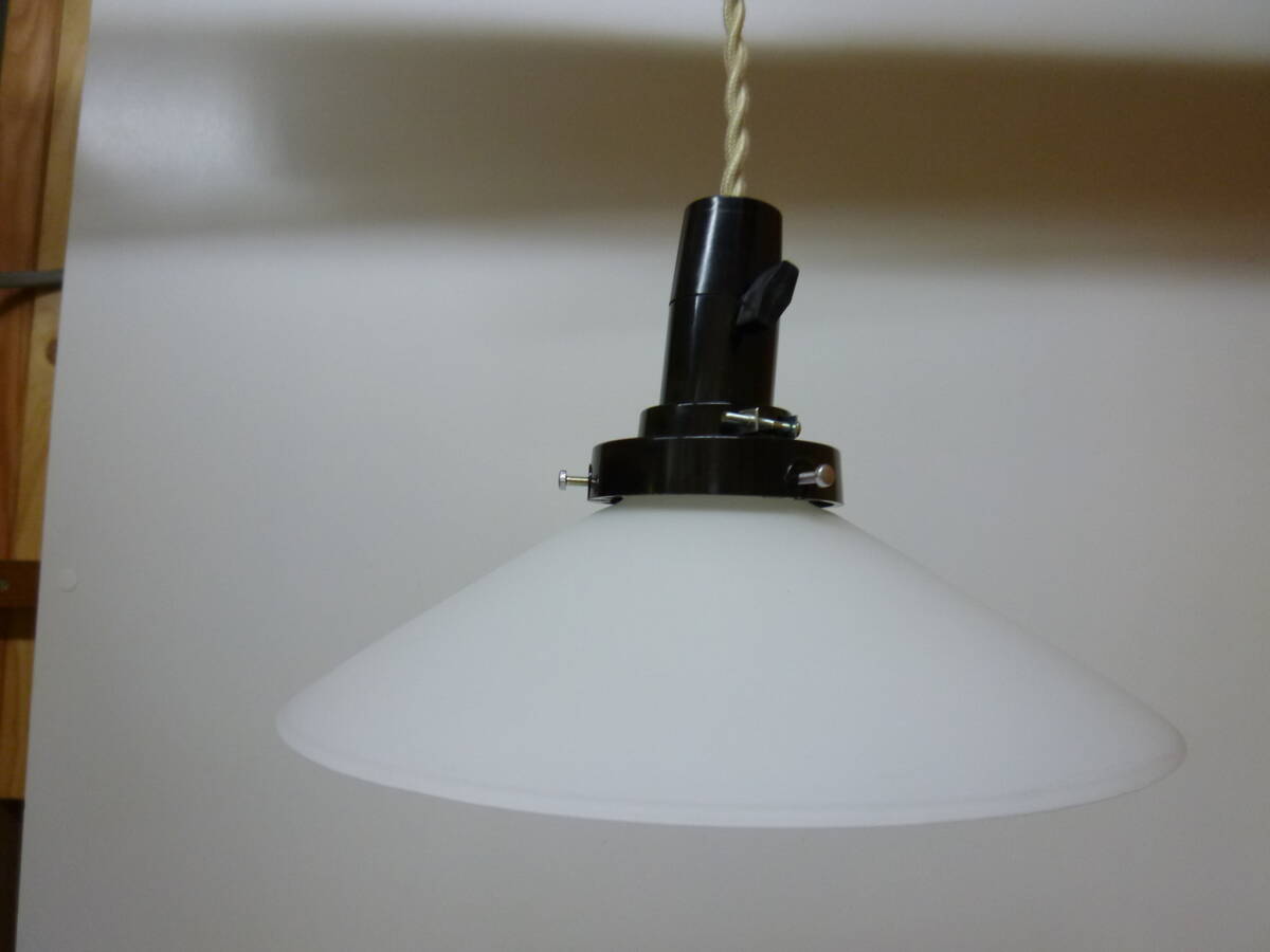 【8983】昭和レトロ 乳白色 平山型ガラスシェード 吊り下げ照明 直径22.5センチ 40Wシリカ電球付き【シェード以外は新品】