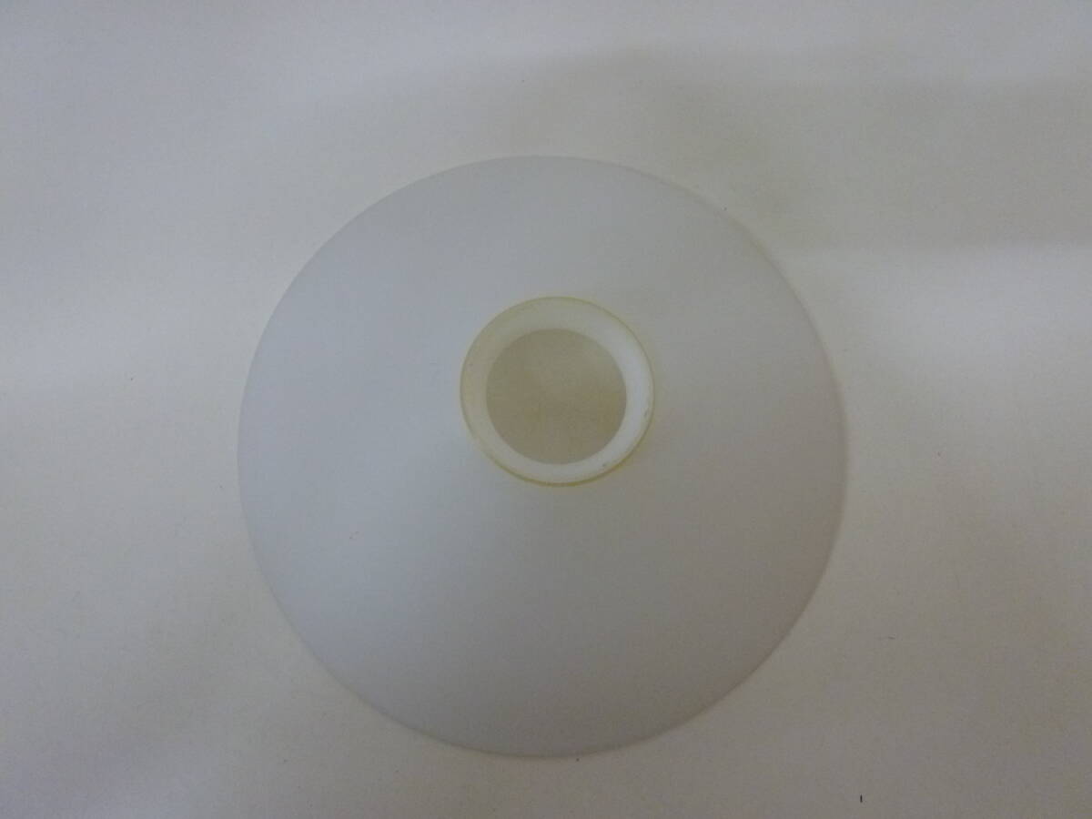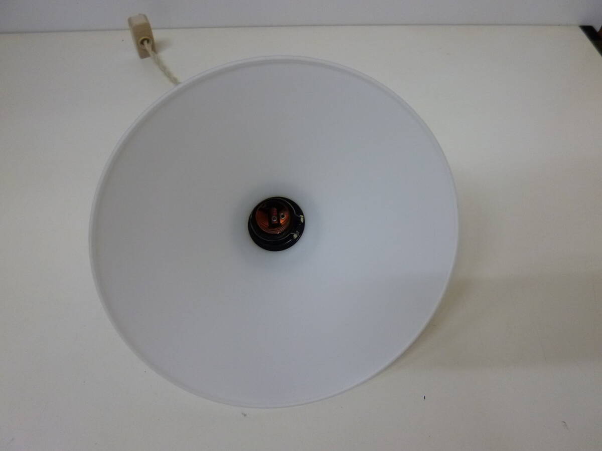 【8983】昭和レトロ 乳白色 平山型ガラスシェード 吊り下げ照明 直径22.5センチ 40Wシリカ電球付き【シェード以外は新品】 です。