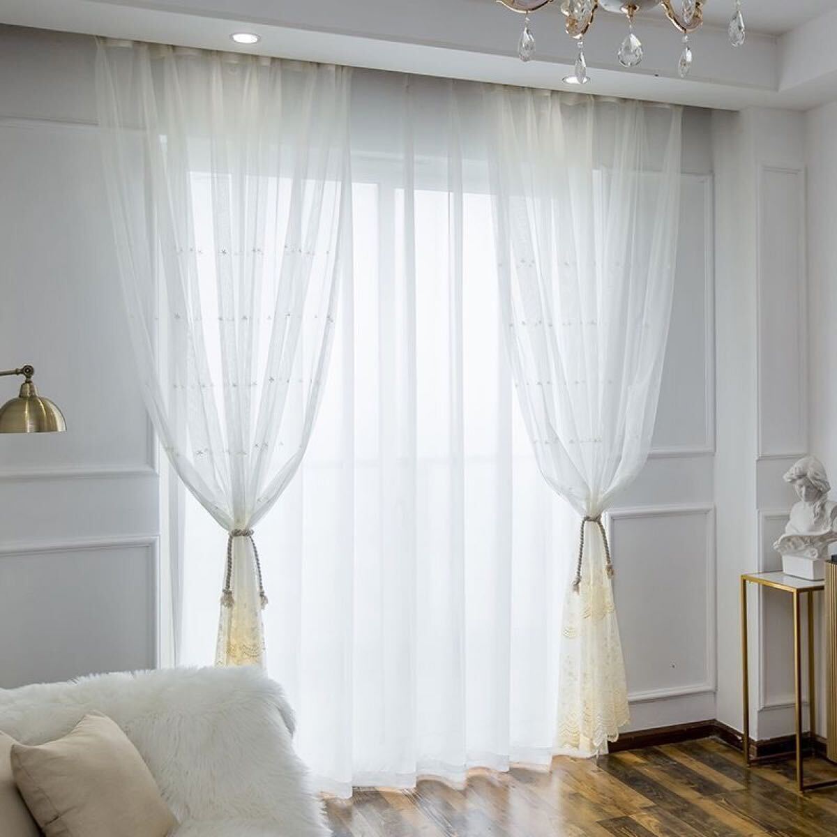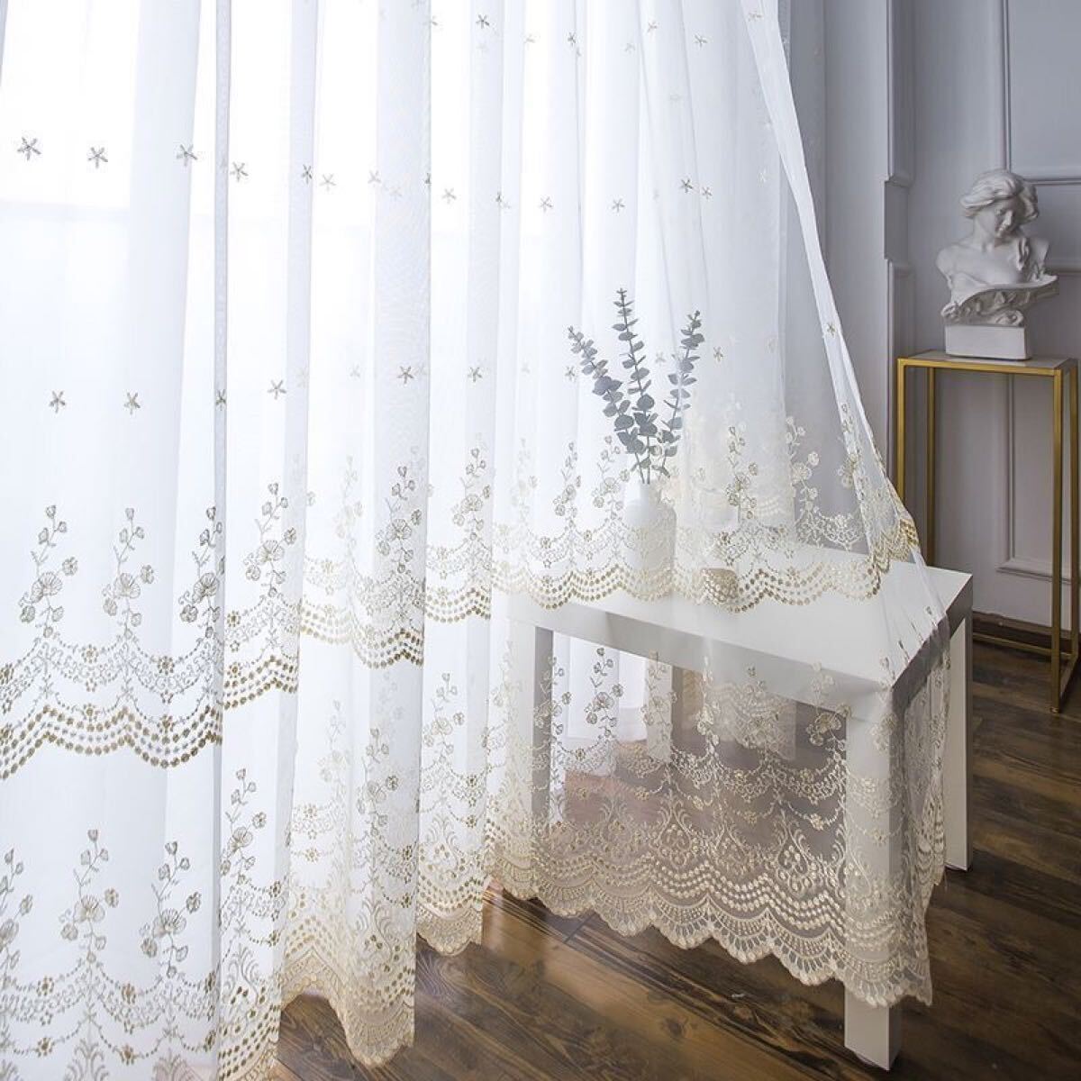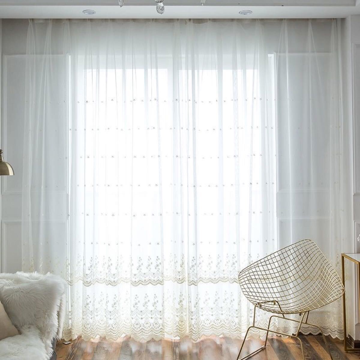 透け感のあるホワイトレースカーテン、刺繍入りで波形の裾が特徴。