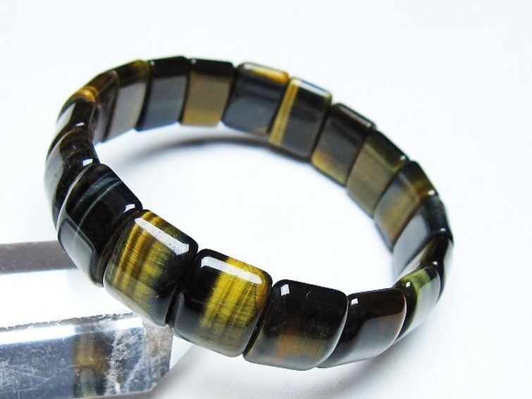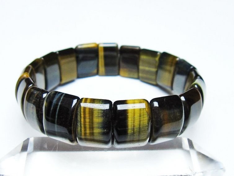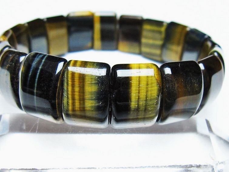| ■商品名: ブルータイガーアイ※青虎目石バングル ■商品ID: T173-5068 ■商品重量:約 35g ■商品サイズ: 高約:15mm 横約:12mm 厚約:6mm 内径円周約:162mm(±5mm) 【タイガーアイ(虎目石)】 タイガーアイは角閃石の一種のクロシドライト(青石綿)に石英が染み込んで酸化し、茶色や黄金色になったものです。 研磨すると光の当たり具合によってキャッツアイ効果、またはシャトヤンシー効果と呼ばれる猫の目のような光の筋が見られ、その輝きと黄金色と褐色の縞模様が虎の眼に見えることからこの名前が付けられました。 ベーシックな金茶色の他にも様々な色合いがあり、温度が高い環境で生成されると深い赤みを帯びたレッドタイガーアイになります。 この他にクロシドライトが酸化せずに生成された灰色のグレータイガーアイは「ウルフズアイ(狼目石)」、濃青色をしたブルータイガーアイは「ホークアイ(鷹目石)」と呼ばれ、タイガーアイとは区別される場合があります。 タイガーアイは視野を広げ正しい判断力と行動力で成功へ導くとされ、ルチルクォーツに匹敵するほどの金運・仕事運アップストーンとして高い知名度と人気を誇っています。 また男性イメージの強い石ではありますが、強力な邪気払い・トラブル回避の効果も持ち合わせていますので女性にはストーカーやセクハラ対策のお守りとしても有用です。 ⇒ タイガーアイをもっと詳しく ◆ワンポイント情報 タイガーアイは塩分によって劣化しやすいので汗が付いた場合は柔らかい布で拭き取るようにし、塩を用いた浄化は行わないように注意しましょう。 |