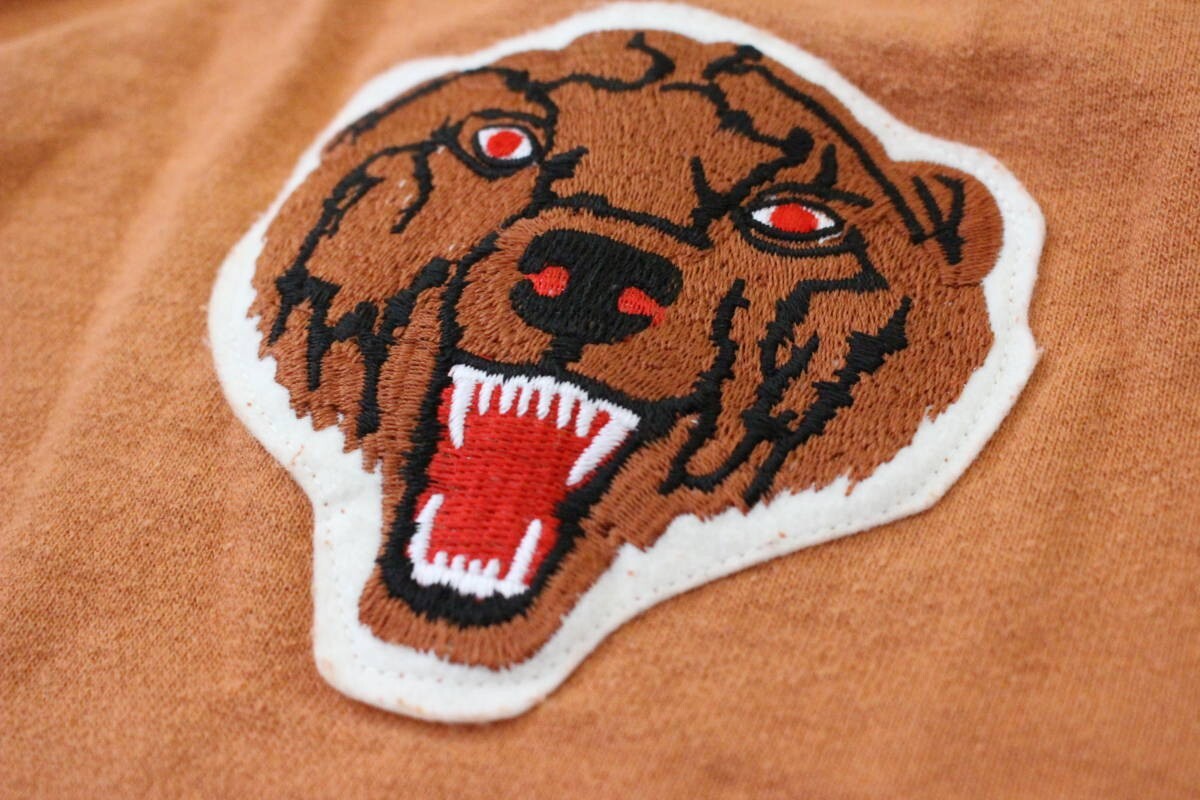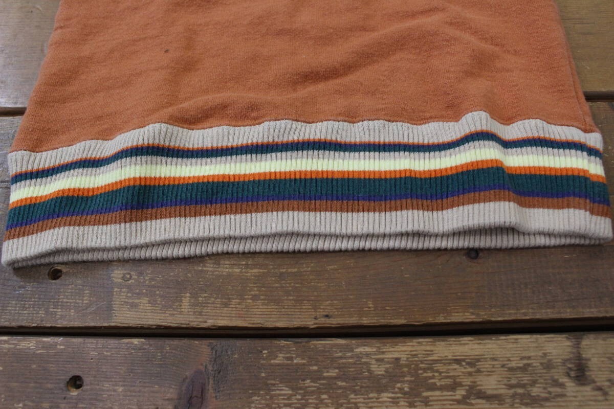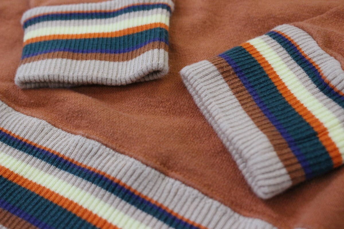 フロント・バックのワッペンや刺繍が特徴的で、袖や裾のボーダーがアクセントになり、カジュアルに着用できる一着かと思われます。