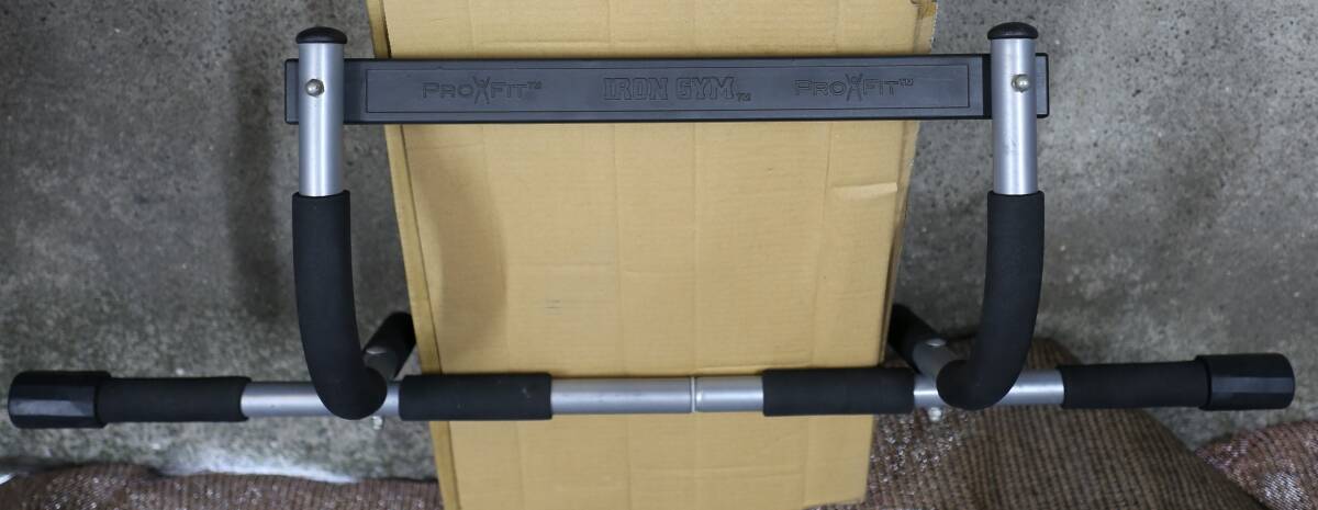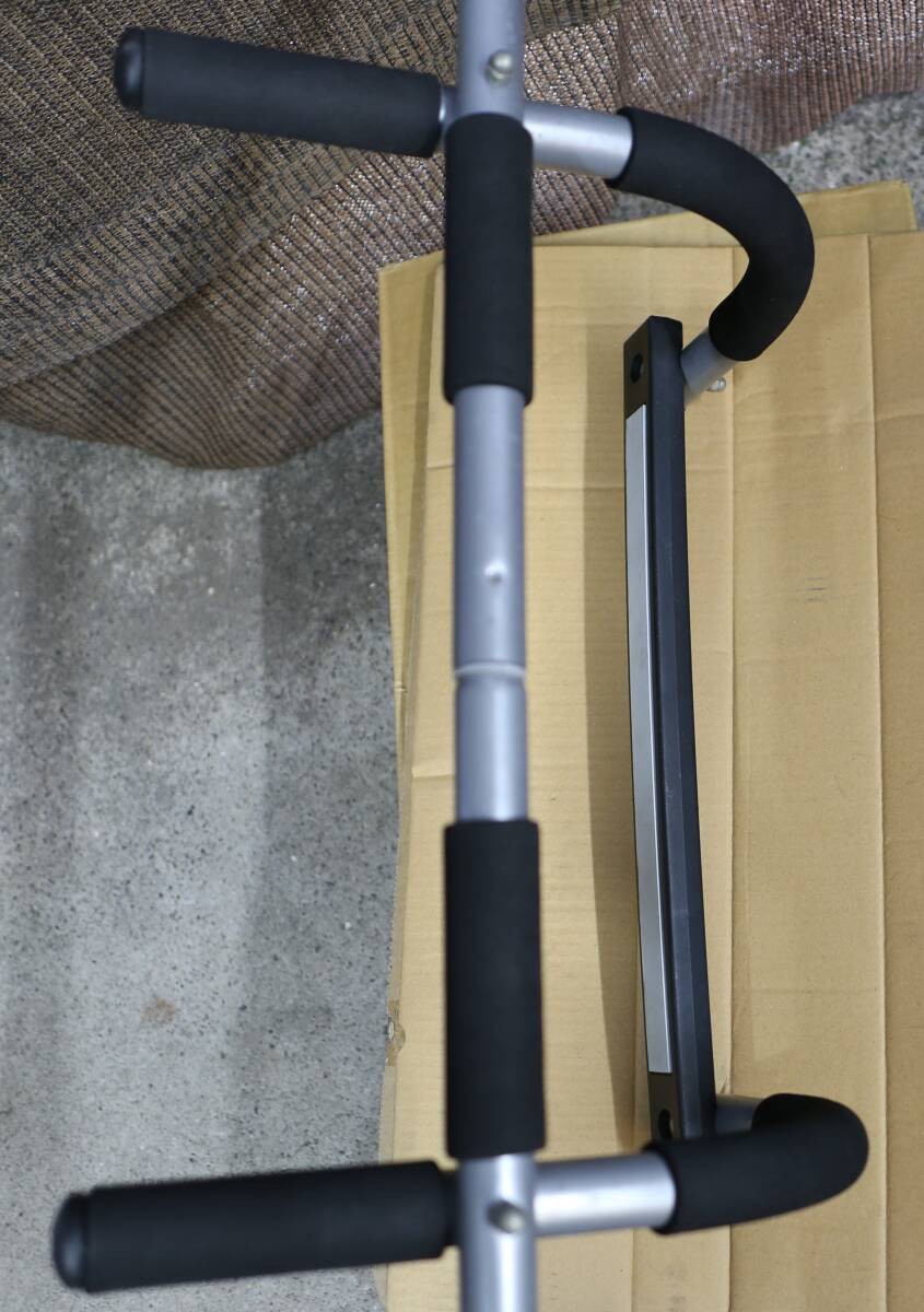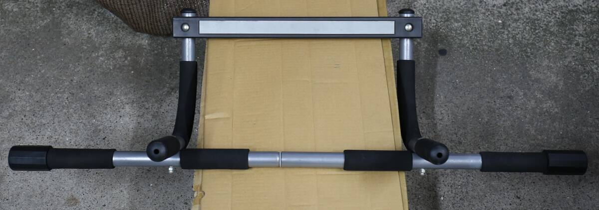 以前に使っていた簡易懸垂マシンです。 ドアフレームなどの金属製の出っ張りに引っかけて使うものです。1センチ程度の出っ張りがあれば大体引っかけられたと思います。 ただし、ご自身の自重と加速度が付きますので、頑丈な場所を良く選んでお使い下さい。
